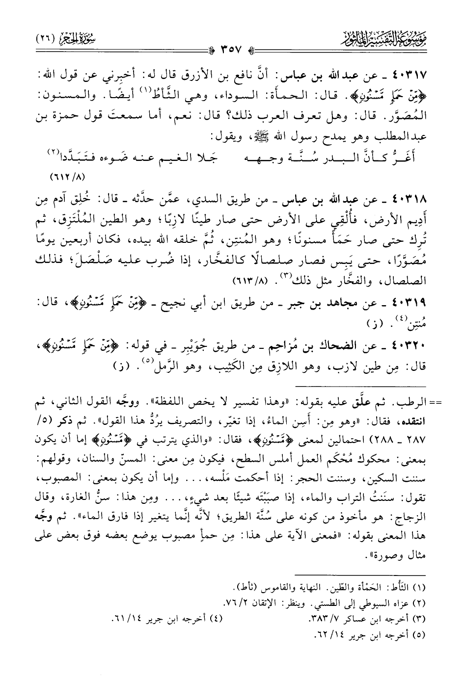 ٤٠٣١٧ - عن عبد الله بن عباس: أنّ نافع بن الأزرق قال له: أخبِرني عن قول الله: {من حمإ مسنون}. قال: الحمأَة: السوداء، وهي الثَّأطُ (¬١) أيضًا. والمسنون: المُصَوَّر. قال: وهل تعرف العرب ذلك؟ قال: نعم، أما سمعتَ قول حمزة بن عبد المطلب وهو يمدح رسول الله - صلى الله عليه وسلم -، ويقول: