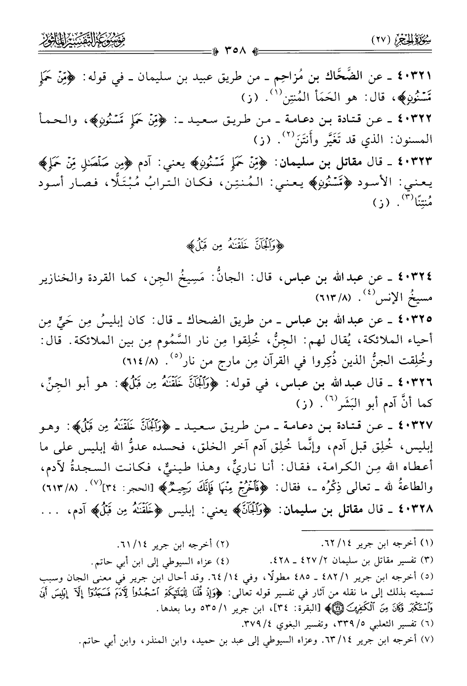 (¬٥) أخرجه ابن جرير ١/ ٤٨٢ - ٤٨٥ مطولًا، وفي ١٤/ ٦٤. وقد أحال ابن جرير في معنى الجان وسبب تسميته بذلك إلى ما نقله من آثار في تفسير قوله تعالى: {وإذ قلنا للملائكة اسجدوا لآدم فسجدوا إلا إبليس أبى واستكبر وكان من الكافرين} [البقرة: ٣٤]، ابن جرير ١/ ٥٣٥ وما بعدها.