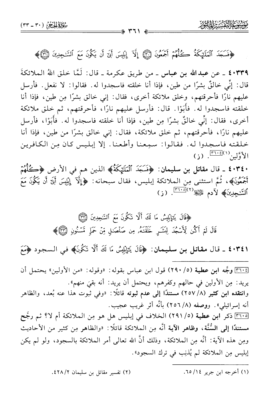٤٠٣٤٠ - قال مقاتل بن سليمان: {فسجد الملائكة} الذين هم في الأرض {كلهم أجمعون}، ثُمَّ استثنى مِن الملائكة إبليس، فقال سبحانه: {إلا إبليس أبى أن يكون مع الساجدين} لآدم - عليه السلام - (¬٢) [٣٦٠٥]. (ز)