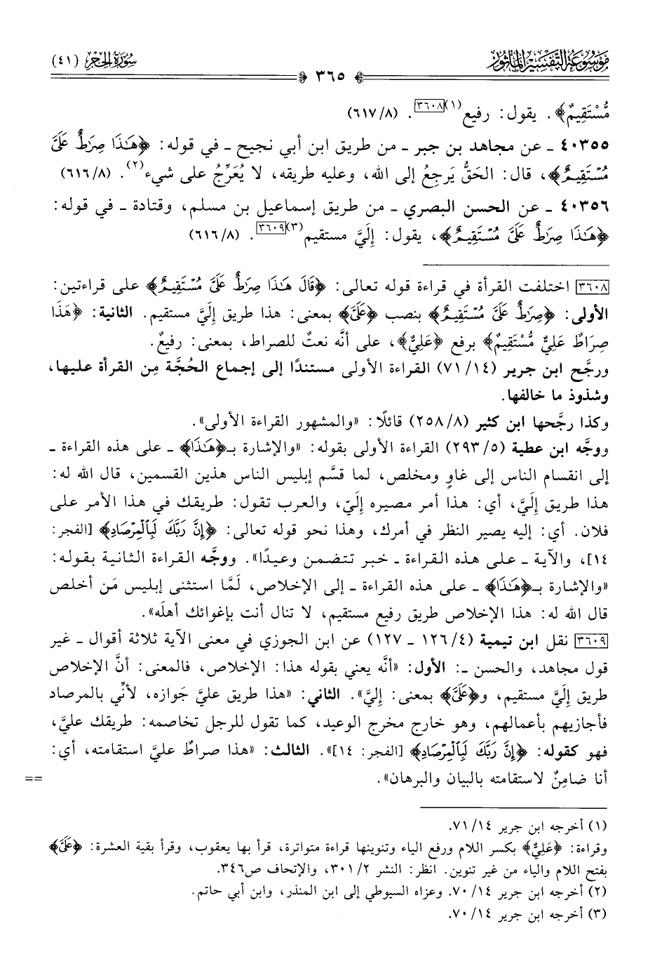 [٣٦٠٩] نقل ابنُ تيمية (٤/ ١٢٦ - ١٢٧) عن ابن الجوزي في معنى الآية ثلاثة أقوال -غير قول مجاهد، والحسن-: الأول: «أنّه يعني بقوله هذا: الإخلاص، فالمعنى: أنّ الإخلاص طريق إلَيَّ مستقيم، و {عَلَيَّ} بمعنى: إليَّ». الثاني: «هذا طريق عليَّ جَوازه، لأنِّي بالمرصاد فأجازيهم بأعمالهم، وهو خارج مخرج الوعيد، كما تقول للرجل تخاصمه: طريقك عليَّ، فهو كقوله: {إنَّ رَبَّكَ لَبِالمِرْصادِ} [الفجر: ١٤]». الثالث: «هذا صراطٌ عليَّ استقامته، أي: أنا ضامِنٌ لاستقامته بالبيان والبرهان».