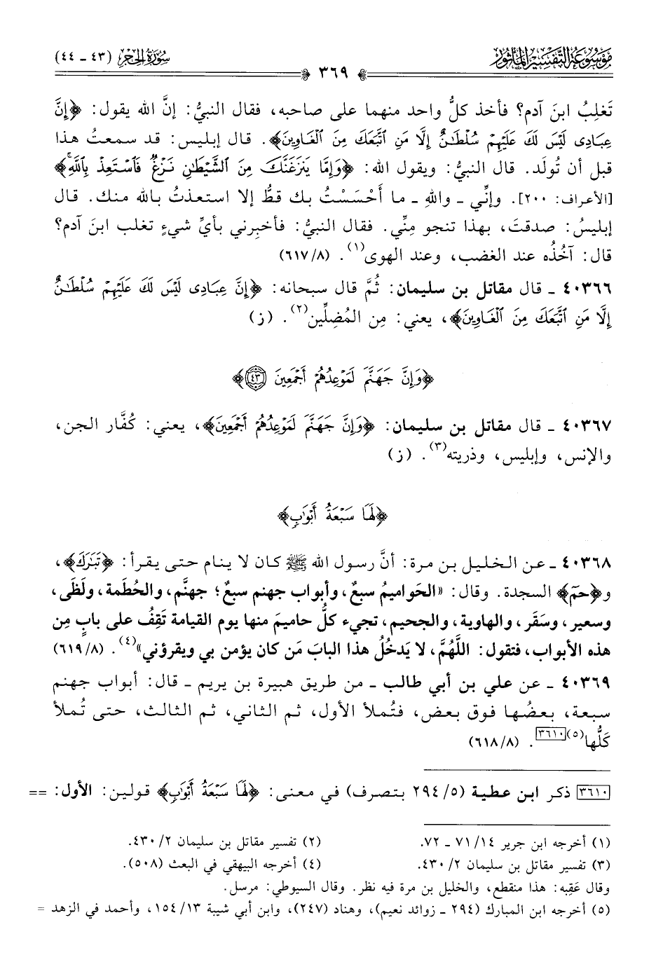 ٤٠٣٦٧ - قال مقاتل بن سليمان: {وإن جهنم لموعدهم أجمعين}، يعني: كُفّار الجن، والإنس، وإبليس، وذريته (¬٣). (ز)