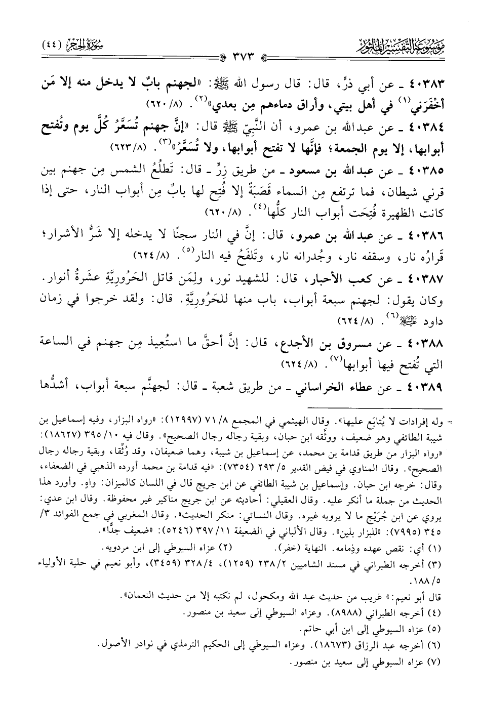 ٤٠٣٨٤ - عن عبد الله بن عمرو، أن النَّبِيّ - صلى الله عليه وسلم - قال: «إنّ جهنم تُسَعَّرُ كُلَّ يوم وتُفتح أبوابها، إلا يوم الجمعة؛ فإنّها لا تفتح أبوابها، ولا تُسَعَّرُ» (¬٣). (٨/ ٦٢٣)