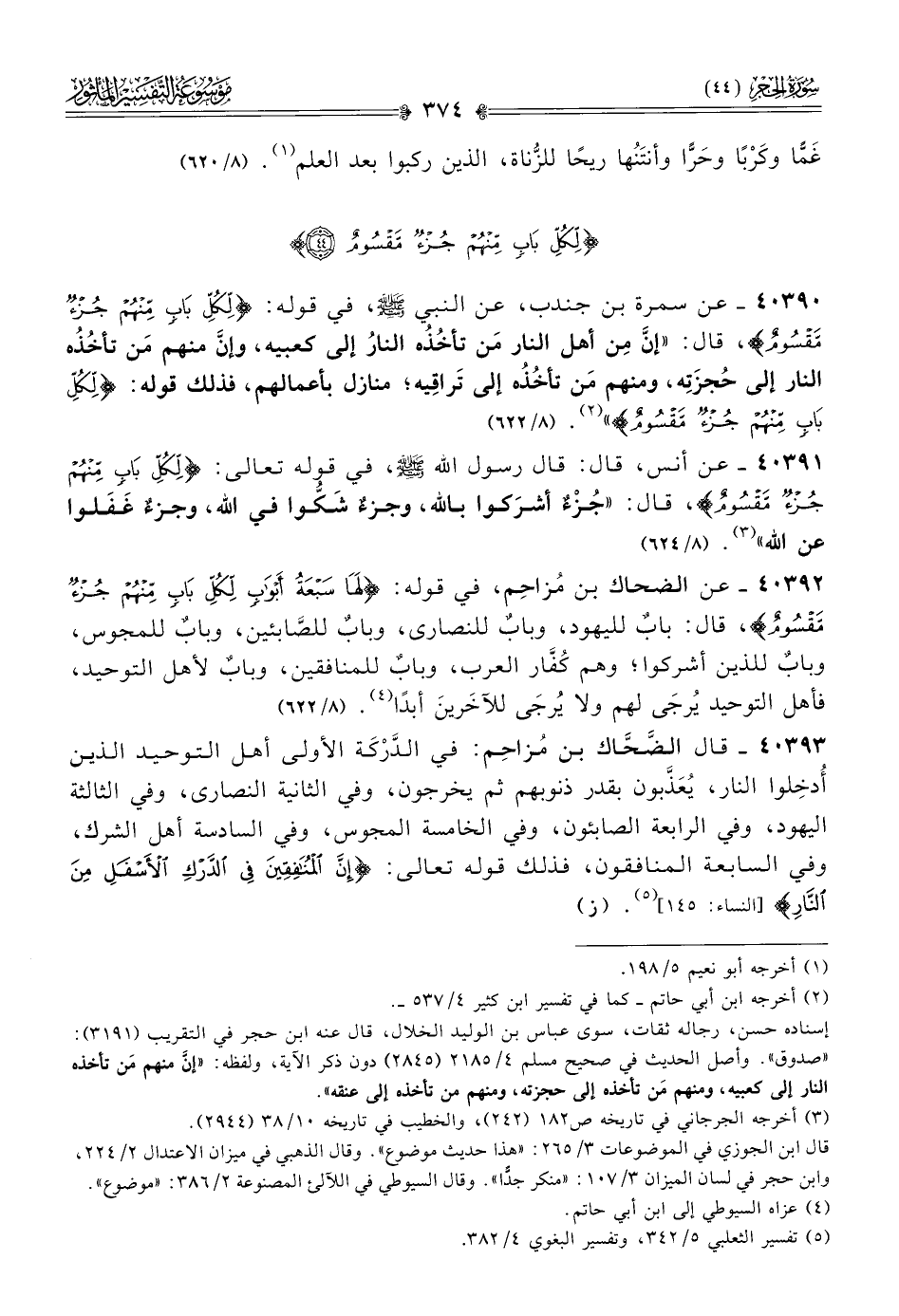 ٤٠٣٩٠ - عن سمرة بن جندب، عن النبي - صلى الله عليه وسلم -، في قوله: {لكل باب منهم جزء مقسوم}، قال: «إنّ مِن أهل النار مَن تأخُذُه النارُ إلى كعبيه، وإنّ منهم مَن تأخُذُه النار إلى حُجزَتِه، ومنهم مَن تأخُذُه إلى تَراقِيه؛ منازل بأعمالهم، فذلك قوله: {لكل باب منهم جزء مقسوم}» (¬٢). (٨/ ٦٦٢)