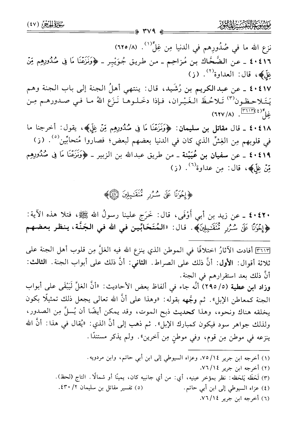 ٤٠٤٢٠ - عن زيد بن أبي أوْفى، قال: خَرَج علينا رسولُ الله - صلى الله عليه وسلم -، فتلا هذه الآية: {إخوانًا على سرر متقابلين}. قال: «المُتَحابِّين في الله في الجَنَّة، ينظر بعضهم