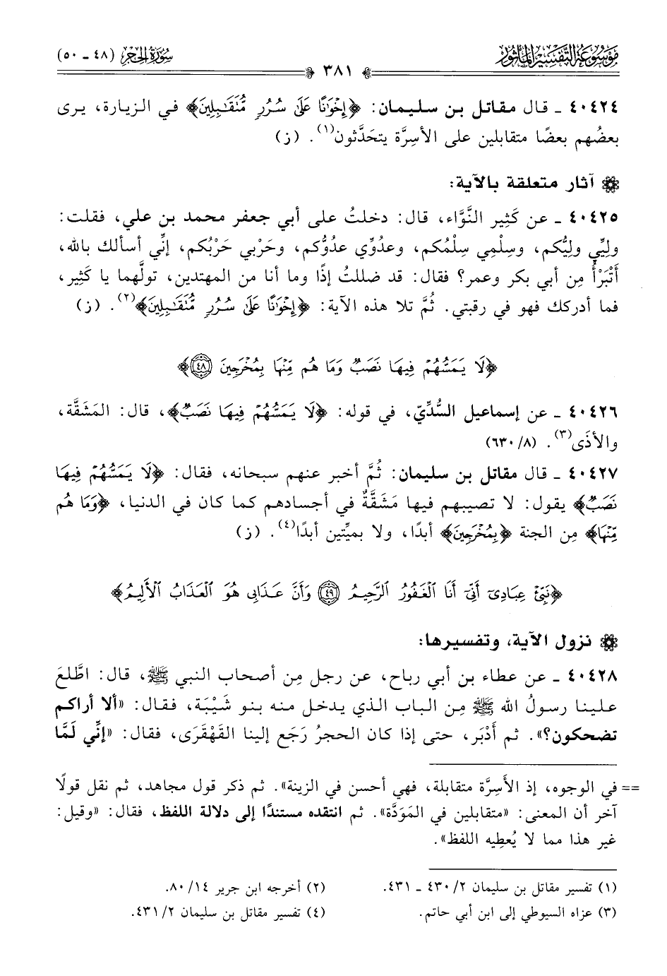 ٤٠٤٢٤ - قال مقاتل بن سليمان: {إخوانا على سرر متقابلين} في الزيارة، يرى بعضُهم بعضًا متقابلين على الأسِرَّة يتحَدَّثون (¬١). (ز)