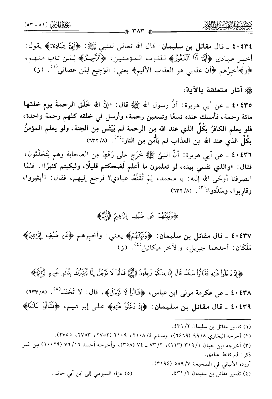 ٤٠٤٣٤ - قال مقاتل بن سليمان: قال الله تعالى للنبي - صلى الله عليه وسلم -: {نبئ عبادي} يقول: أخبِر عبادي {أني أنا الغفور} لذنوب المؤمنين، {الرحيم} لِمَن تاب منهم، {و} أخبِرْهم {أن عذابي هو العذاب الأليم} يعني: الوَجِيع لِمَن عصاني (¬١). (ز)