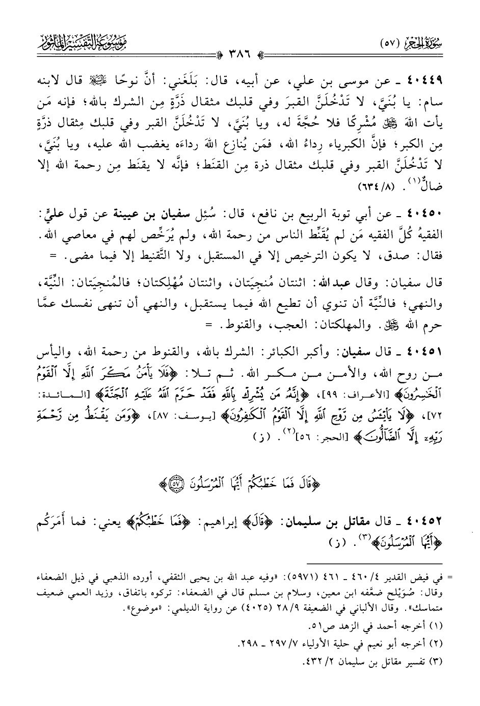 ٤٠٤٥١ - قال سفيان: وأكبر الكبائر: الشرك بالله، والقنوط من رحمة الله، واليأس من روح الله، والأمن من مكر الله. ثم تلا: {فلا يأمن مكر الله إلا القوم الخاسرون} [الأعراف: ٩٩]، {أنه من يشرك بالله فقد حرم الله عليه الجنة} [المائدة: ٧٢]، {لا ييأس من روح الله إلا القوم الكافرون} [يوسف: ٨٧]، {ومن يقنط من رحمة ربه إلا الضالون} [الحجر: ٥٦] (¬٢). (ز)