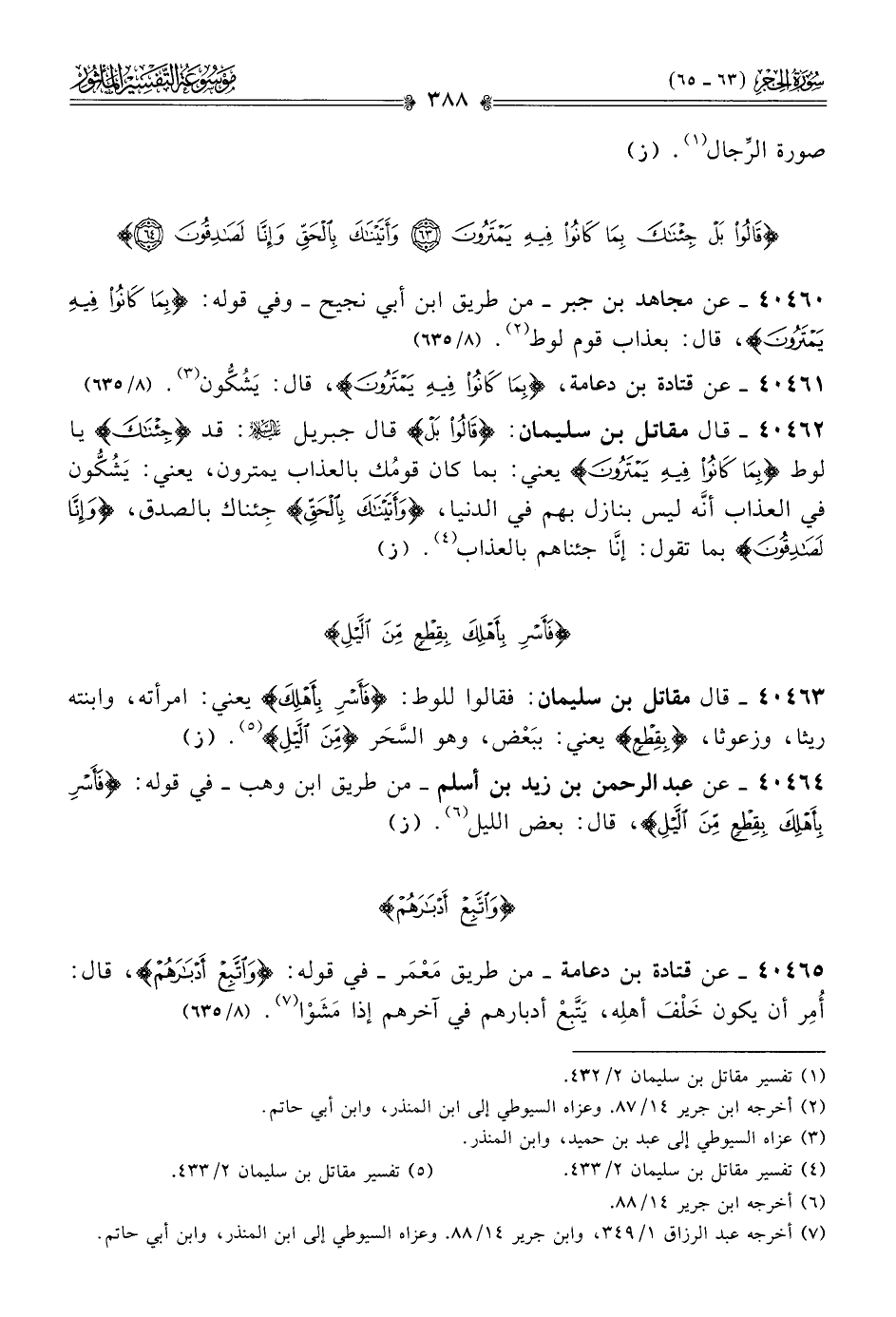 ٤٠٤٦٠ - عن مجاهد بن جبر -من طريق ابن أبي نجيح- وفي قوله: {بما كانوا فيه يمترون}، قال: بعذاب قوم لوط (¬٢).