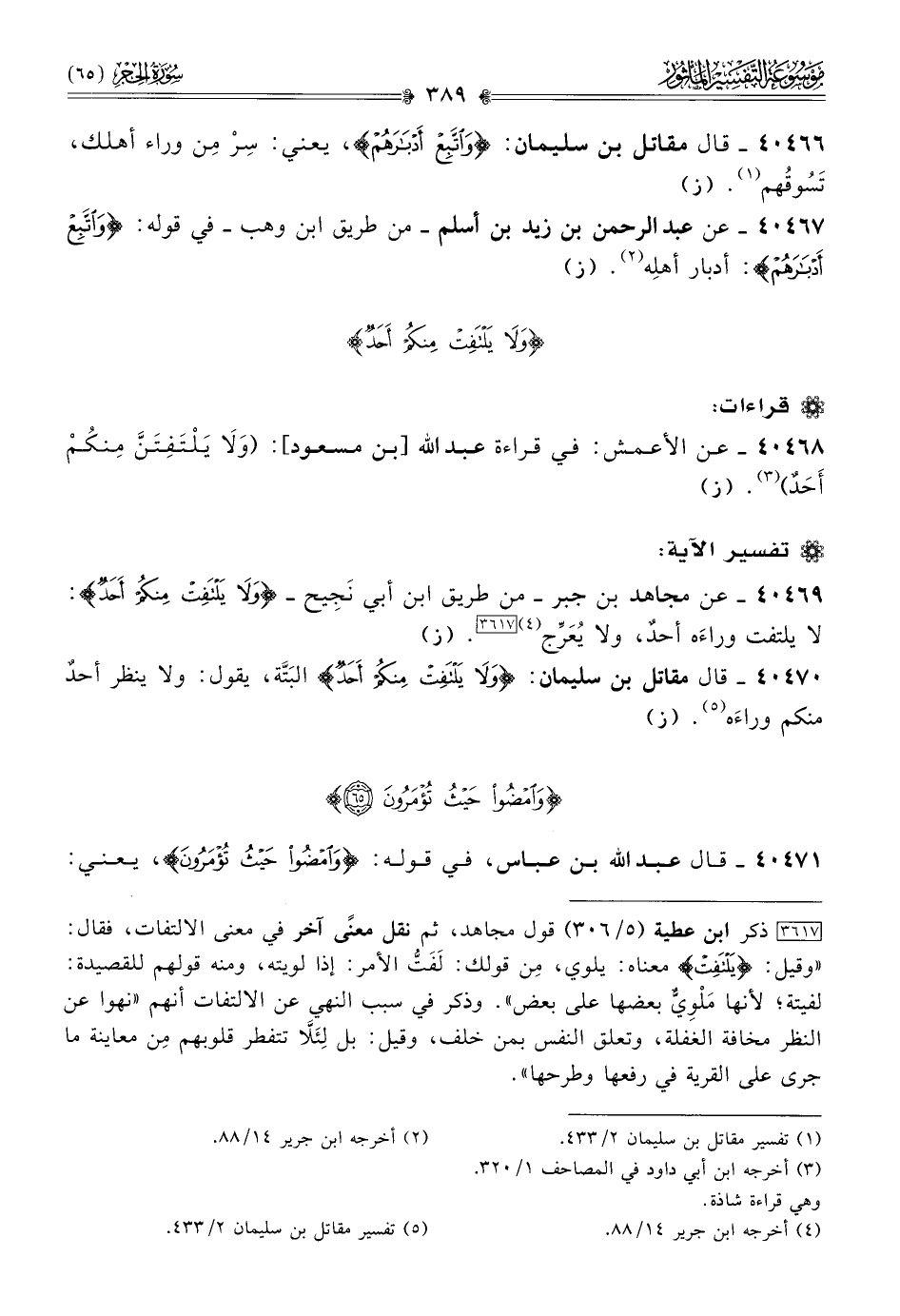 ٤٠٤٦٩ - عن مجاهد بن جبر -من طريق ابن أبي نَجِيح- {ولا يلتفت منكم أحد}: لا يلتفت وراءَه أحدٌ، ولا يُعَرِّج (¬٤) [٣٦١٧]. (ز)