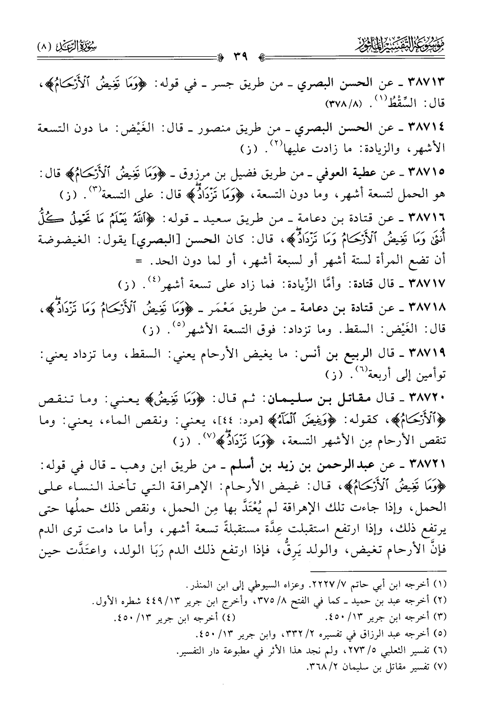 ٣٨٧١٣ - عن الحسن البصري -من طريق جسر- في قوله: {وما تغيضُ الأرحامُ}، قال: السِّقْطُ (¬١). (٨/ ٣٧٨)