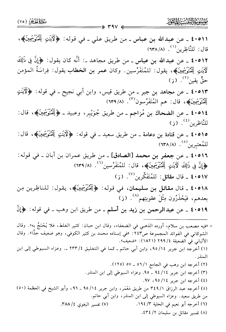 ٤٠٥١٦ - عن جعفر بن محمد [الصادق]-من طريق عمران بن أبان- في قوله: {إن في ذلك لآيات للمتوسمين}، قال: للمُتَفَرِّسين (¬٦). (٨/ ٦٣٩)
