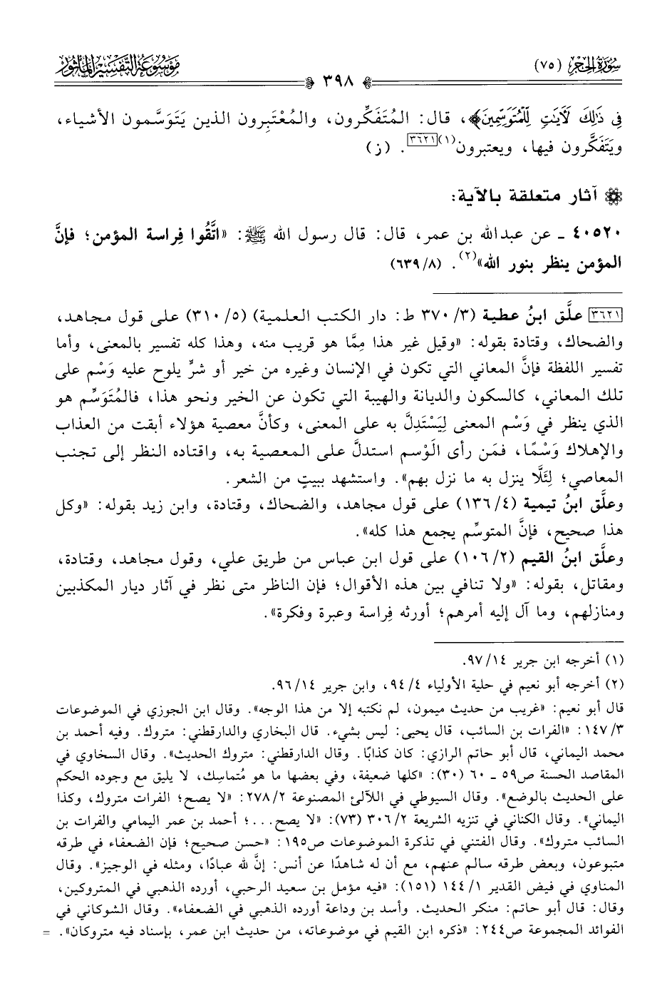 ٤٠٥٢٠ - عن عبد الله بن عمر، قال: قال رسول الله - صلى الله عليه وسلم -: «اتَّقُوا فِراسة المؤمن؛ فإنّ المؤمن ينظر بنور الله» (¬٢). (٨/ ٦٣٩)
