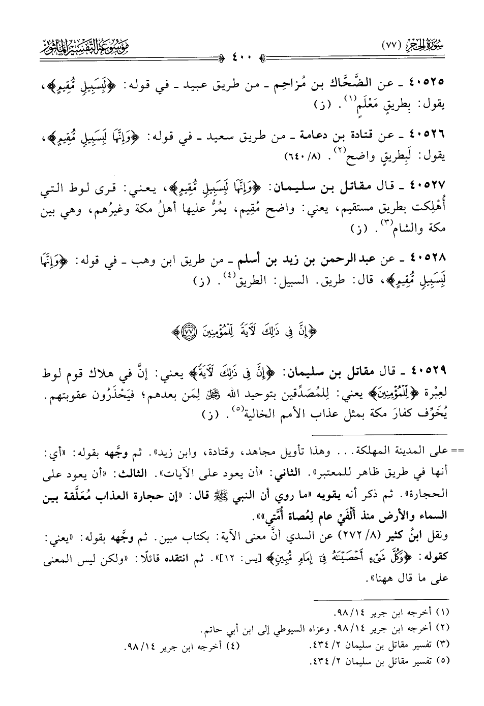 ٤٠٥٢٦ - عن قتادة بن دعامة -من طريق سعيد- في قوله: {وإنها لبسبيل مقيم}، يقول: لَبِطريقٍ واضح (¬٢). (٨/ ٦٤٠)