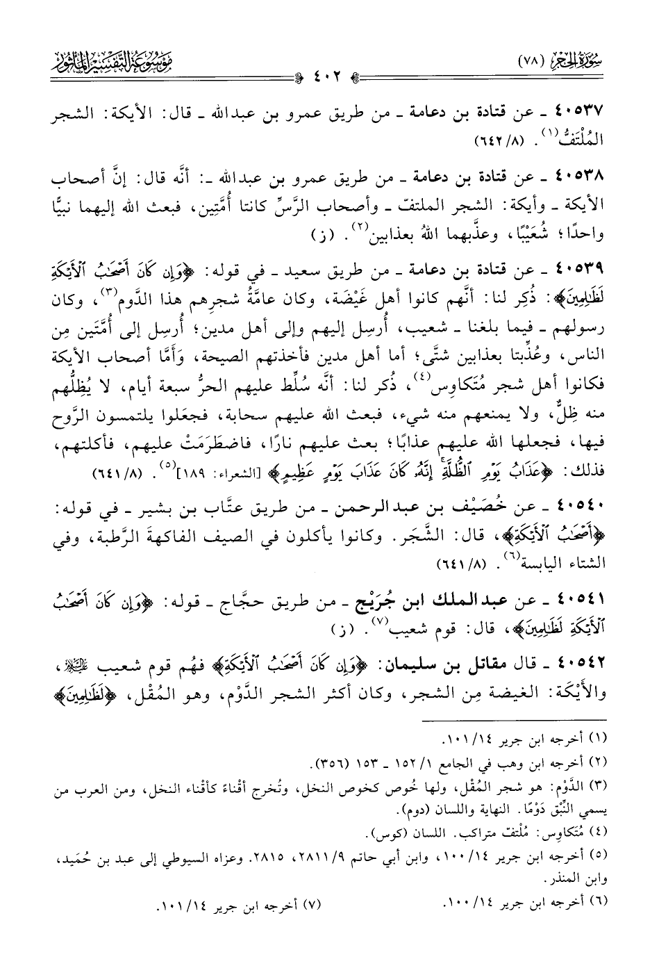 ٤٠٥٣٩ - عن قتادة بن دعامة -من طريق سعيد- في قوله: {وإن كان أصحاب الأيكة لظالمين}: ذُكِر لنا: أنّهم كانوا أهل غَيْضَة، وكان عامَّةُ شجرِهم هذا الدَّوم (¬٣)، وكان رسولهم -فيما بلغنا- شعيب، أُرسِل إليهم وإلى أهل مدين؛ أُرسِل إلى أُمَّتَين مِن الناس، وعُذِّبتا بعذابين شتّى؛ أما أهل مدين فأخذتهم الصيحة، وأَمّا أصحاب الأيكة فكانوا أهل شجر مُتَكاوِس (¬٤)، ذُكر لنا: أنّه سُلِّط عليهم الحرُّ سبعة أيام، لا يُظِلُّهم منه ظِلٌّ، ولا يمنعهم منه شيء، فبعث الله عليهم سحابة، فجعَلوا يلتمسون الرَّوح فيها، فجعلها الله عليهم عذابًا؛ بعث عليهم نارًا، فاضطَرَمَتْ عليهم، فأكلتهم، فذلك: {عذاب يوم الظُّلَّةِ إنه كان عذاب يوم عظيم} [الشعراء: ١٨٩] (¬٥). (٨/ ٦٤١)