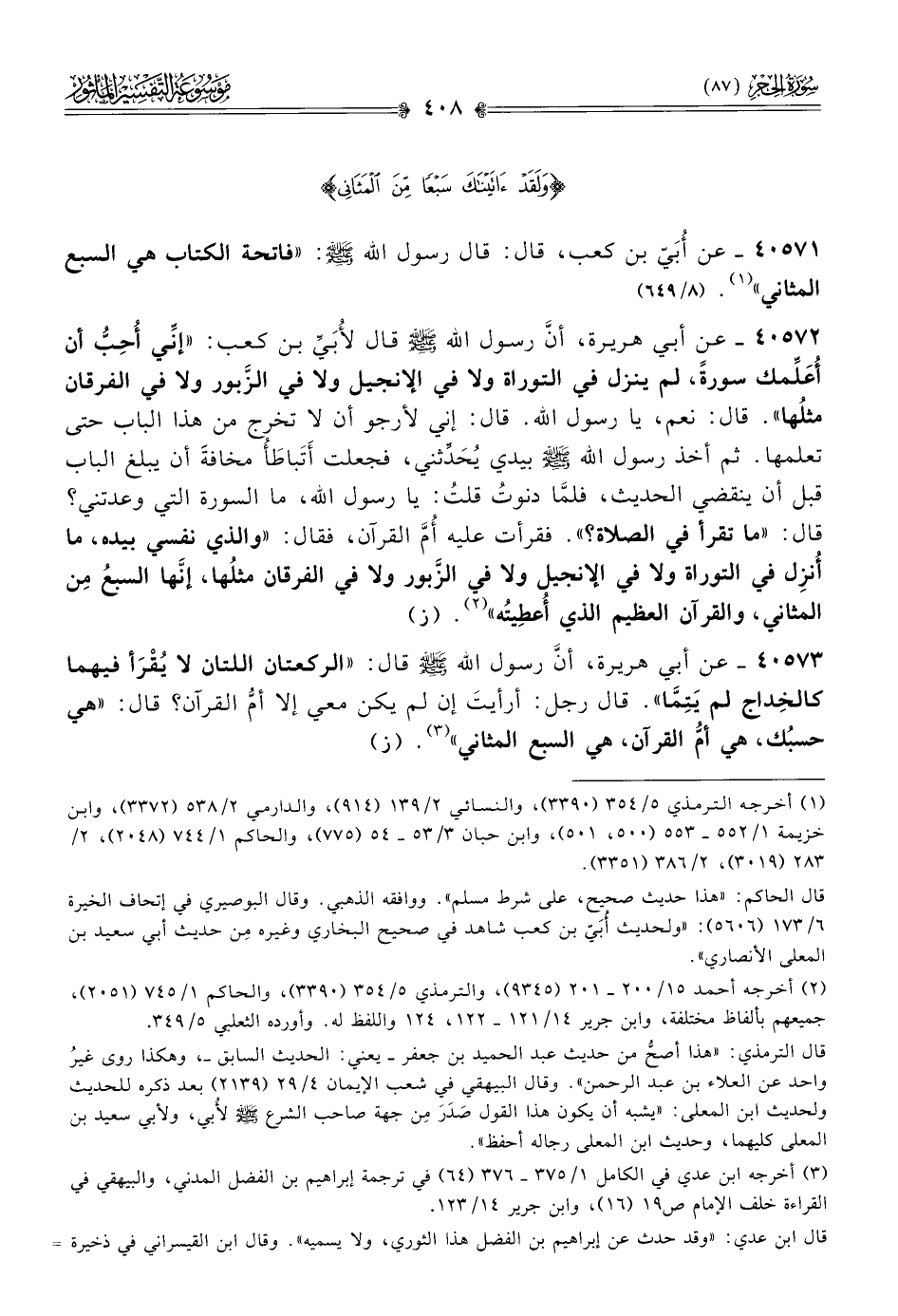 ٤٠٥٧٢ - عن أبي هريرة، أنّ رسول الله - صلى الله عليه وسلم - قال لأُبَيِّ بن كعب: «إنِّي أُحِبُّ أن أُعَلِّمك سورةً، لم ينزل في التوراة ولا في الإنجيل ولا في الزَّبور ولا في الفرقان مثلُها». قال: نعم، يا رسول الله. قال: إني لأرجو أن لا تخرج من هذا الباب حتى تعلمها. ثم أخذ رسول الله - صلى الله عليه وسلم - بيدي يُحَدِّثني، فجعلت أتَباطَأُ مخافةَ أن يبلغ الباب قبل أن ينقضي الحديث، فلمّا دنوتُ قلتُ: يا رسول الله، ما السورة التي وعدتني؟ قال: «ما تقرأ في الصلاة؟». فقرأت عليه أُمَّ القرآن، فقال: «والذي نفسي بيده، ما أُنزِل في التوراة ولا في الإنجيل ولا في الزَّبور ولا في الفرقان مثلُها، إنّها السبعُ مِن المثاني، والقرآن العظيم الذي أُعطِيتُه» (¬٢). (ز)