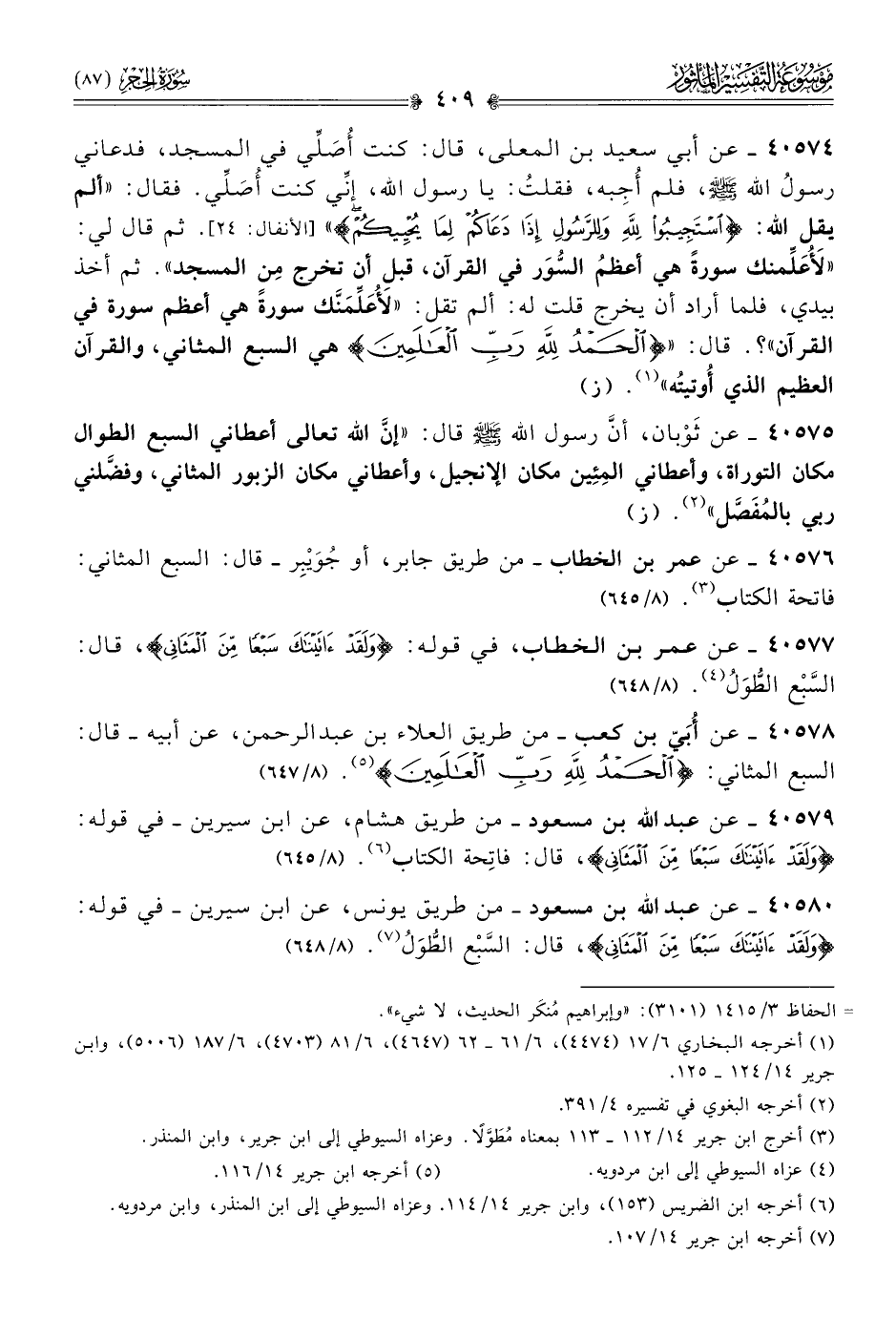 ٤٠٥٧٩ - عن عبد الله بن مسعود -من طريق هشام، عن ابن سيرين- في قوله: {ولقد ءاتيناك سبعًا من المثاني}، قال: فاتِحة الكتاب (¬٦). (٨/ ٦٤٥)