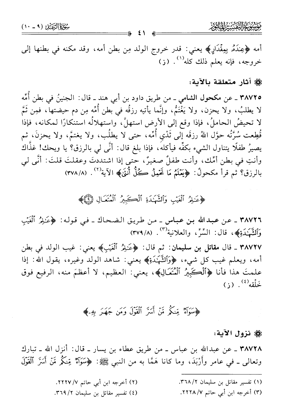 ٣٨٧٢٧ - قال مقاتل بن سليمان: ثم قال: {عالم الغيب} يعني: غيب الولد في بطن أمه، ويعلم غيب كل شيء، {والشهادة} يعني: شاهد الولد وغيره، يقول الله: إذا علمتَ هذا فأنا {الكبير المتعال}، يعني: العظيم، لا أعظمَ منه، الرفيع فوق خَلْقه (¬٤). (ز)