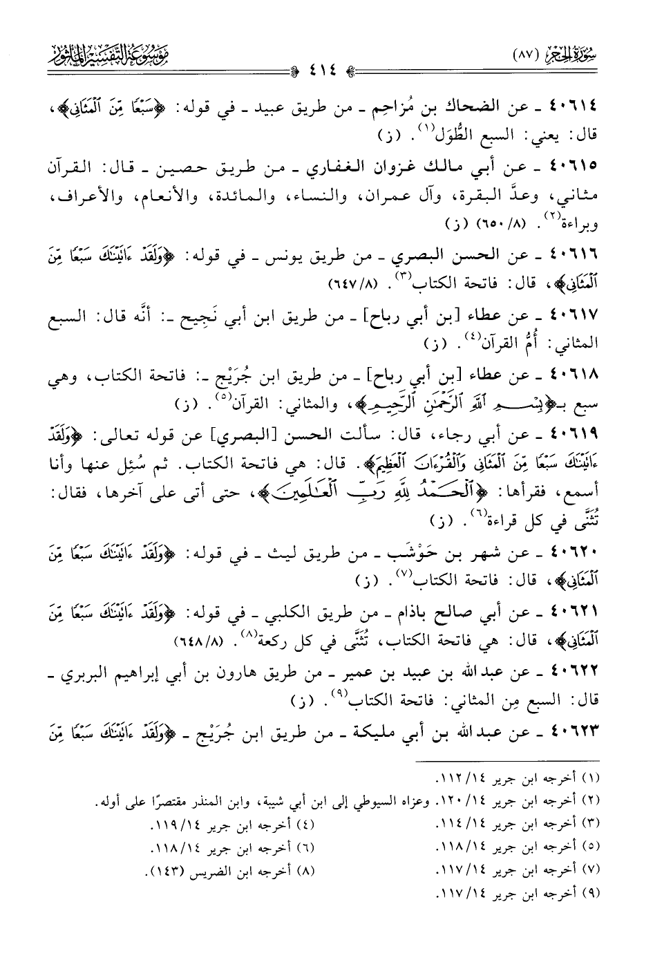 ٤٠٦١٦ - عن الحسن البصري -من طريق يونس- في قوله: {ولقد ءاتيناك سبعًا من المثاني}، قال: فاتحة الكتاب (¬٣). (٨/ ٦٤٧)