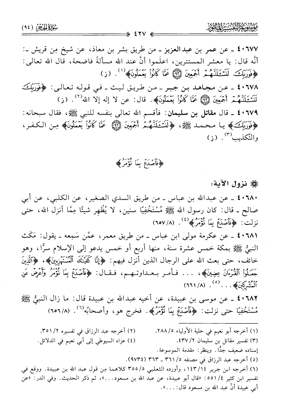 ٤٠٦٨١ - عن عكرمة مولى ابن عباس -من طريق معمر، عمَّن سَمِعه- يقول: مَكَث النبيُّ - صلى الله عليه وسلم - بمكة خمس عشرة سنة، منها أربع أو خمس يدعو إلى الإسلام سرًّا، وهو خائف، حتى بعث الله على الرجال الذين أنزل فيهم: {إنا كفيناك المستهزئين}، {الذين جعلوا القرآن عضين}، ... فأمر بعداوتهم، فقال: {فاصدع بما تؤمر وأعرض عن المشركين} ... (¬٥). (٨/ ٦٦١)