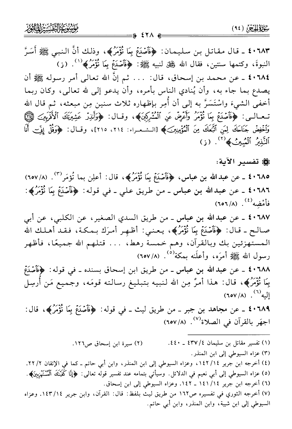 ٤٠٦٨٤ - عن محمد بن إسحاق، قال: ... ثم إنّ الله تعالى أمر رسوله - صلى الله عليه وسلم - أن يصدع بما جاء به، وأن يُنادي الناس بأمره، وأن يدعو إلى لله تعالى، وكان ربما أخفى الشيءَ واسْتَسَرَّ به إلى أن أُمِر بإظهاره ثلاث سنين مِن مبعثه، ثم قال الله تعالى: {فاصدع بما تؤمر وأعرض عن المشركين}، وقال: {وأنذر عشيرتك الأقربين * واخفض جناحك لمن اتبعك من المؤمنين} [الشعراء: ٢١٤ - ٢١٥]، وقال: {وقل إني أنا النذير المبين} (¬٢). (ز)