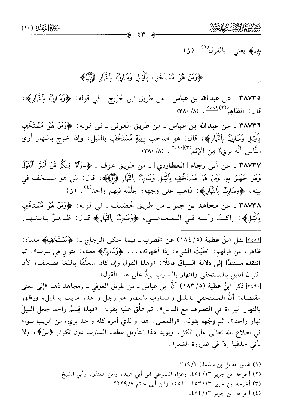 ٣٨٧٣٥ - عن عبد الله بن عباس -من طريق ابن جُرَيْج- في قوله: {وساربٌ بالنهار}، قال: الظاهِرُ (¬٢) [٣٤٨٩]. (٨/ ٣٨٠)
