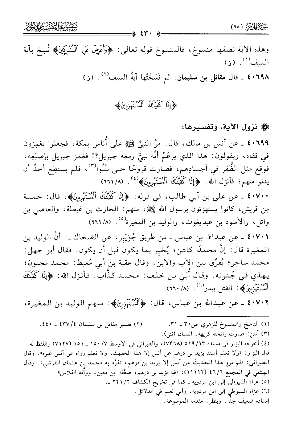 ٤٠٧٠٢ - عن عبد الله بن عباس، قال: {المستهزئين}: منهم الوليد بن المغيرة،