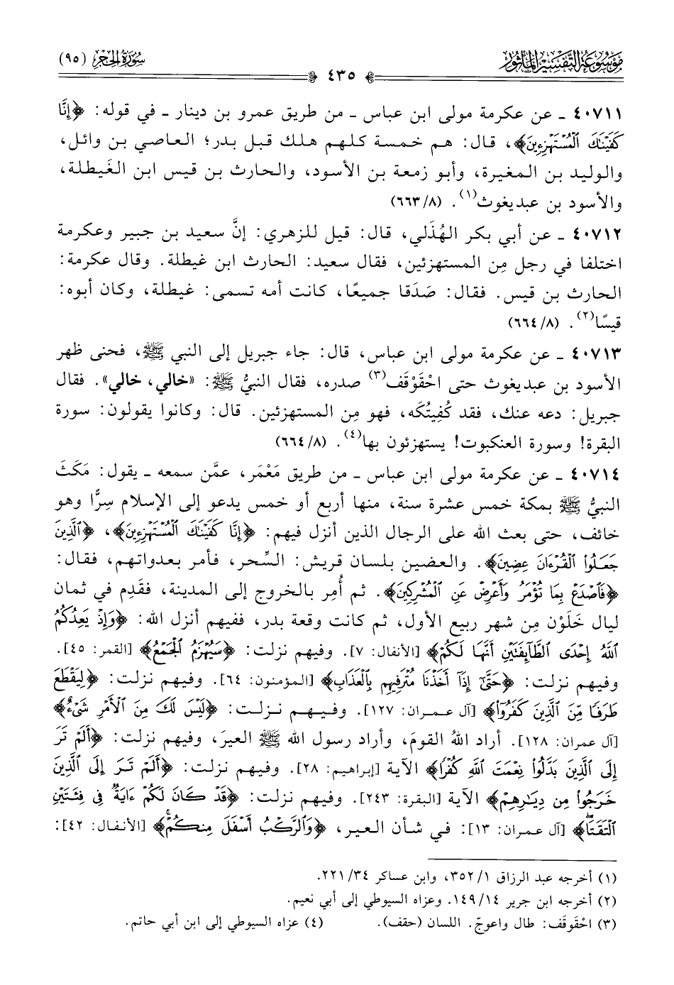 ٤٠٧١٤ - عن عكرمة مولى ابن عباس -من طريق مَعْمَر، عمَّن سمعه- يقول: مَكَثَ النبيُّ - صلى الله عليه وسلم - بمكة خمس عشرة سنة، منها أربع أو خمس يدعو إلى الإسلام سِرًّا وهو خائف، حتى بعث الله على الرجال الذين أنزل فيهم: {إنا كفيناك المستهزئين}، {الذين جعلوا القرآن عضين}. والعضين بلسان قريش: السِّحر، فأمر بعدواتهم، فقال: {فاصدع بما تُؤمر وأعرض عن المشركين}. ثم أُمِر بالخروج إلى المدينة، فقَدِم في ثمان ليال خَلَوْن مِن شهر ربيع الأول، ثم كانت وقعة بدر، ففيهم أنزل الله: {وإذ يَعدكم الله إحدى الطآئفتين أنها لكم} [الأنفال: ٥]. وفيهم نزلت: {سيهزم الجمع} [القمر: ٤٥]. وفيهم نزلت: {حتى إذا أخذنا مترفيهم بالعذاب} [المؤمنون: ٦٤]. وفيهم نزلت: {ليقطع طرفًا من الذين كفروا} [آل عمران: ١٢٧]. وفيهم نزلت: {ليس لك من الأمر شيء} [آل عمران: ١٢٨]. أراد اللهُ القومَ، وأراد رسول الله - صلى الله عليه وسلم - العيرَ، وفيهم نزلت: {ألم تر إلى الذين بدلوا نعمت الله كفرًا} الآية [إبراهيم: ٢٨]. وفيهم نزلت: {ألم تر إلى الذين خرجوا من ديارهم} الآية [البقرة: ٢٤٣]. وفيهم نزلت: {قد كان لكم آية في فئتين التقتا} [آل عمران: ١٣]: في شأن العير، {والركب أسفل منكم} [الأنفال: ٤٢]: