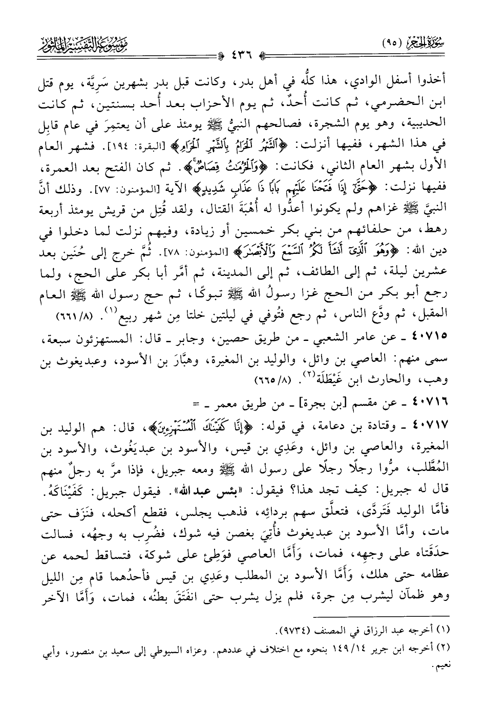أخذوا أسفل الوادي، هذا كلُّه في أهل بدر، وكانت قبل بدر بشهرين سَرِيَّة، يوم قتل ابن الحضرمي، ثم كانت أحدٌ، ثم يوم الأحزاب بعد أُحد بسنتين، ثم كانت الحديبية، وهو يوم الشجرة، فصالحهم النبيُّ - صلى الله عليه وسلم - يومئذ على أن يعتمِرَ في عام قابِل في هذا الشهر، ففيها أنزلت: {الشهر الحرام بالشهر الحرام} [البقرة: ١٤٩]. فشهر العام الأول بشهر العام الثاني، فكانت: {والحرمات قصاص}. ثم كان الفتح بعد العمرة، ففيها نزلت: {حتى إذا فتحنا عليهم بابًا ذا عذاب شديد} الآية [المؤمنون: ٧٧]. وذلك أنّ النبيَّ - صلى الله عليه وسلم - غزاهم ولم يكونوا أعدُّوا له أُهْبَةَ القتال، ولقد قُتِل من قريش يومئذ أربعة رهط، من حلفائهم من بني بكر خمسين أو زيادة، وفيهم نزلت لما دخلوا في دين الله: {وهو الذي أنشأ لكم السمع والأبصار} [المؤمنون: ٧٨]. ثُمَّ خرج إلى حُنَين بعد عشرين ليلة، ثم إلى الطائف، ثم إلى المدينة، ثم أمَّر أبا بكر على الحج، ولما رجع أبو بكر من الحج غزا رسولُ الله - صلى الله عليه وسلم - تبوكًا، ثم حج رسول الله - صلى الله عليه وسلم - العام المقبل، ثم ودَّع الناس، ثم رجع فتُوفي في ليلتين خلتا مِن شهر ربيع (¬١). (٨/ ٦٦١)