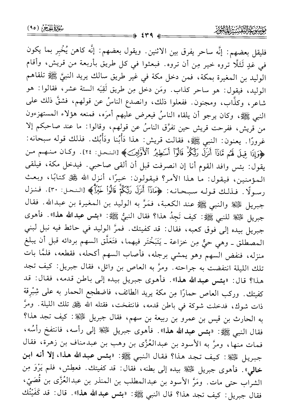 فليقل بعضهم: إنّه ساحر يفرق بين الاثنين. ويقول بعضهم: إنّه كاهن يُخْبِر بما يكون في غدٍ لَئَلّا تروه خير مِن أن تروه. فبعثوا في كل طريق بأربعة من قريش، وأقام الوليد بن المغيرة بمكة، فمن دخل مكة في غير طريق سالك يريد النبيَّ - صلى الله عليه وسلم - تلقاهم الوليد، فيقول: هو ساحر كذاب. ومَن دخل مِن طريق لَقِيَه الستة عشر، فقالوا: هو شاعر، وكذّاب، ومجنون. ففعلوا ذلك، وانصدع الناسُ عن قولهم، فشقَّ ذلك على النبي - صلى الله عليه وسلم -، وكان يرجو أن يلقاه الناسُ فيعرض عليهم أمرَه، فمنعه هؤلاء المستهزءون من قريش، ففرحت قريش حين تفرَّق الناسُ عن قولهم، وقالوا: ما عند صاحبكم إلا غرورًا. يعنون: النبي - صلى الله عليه وسلم -، فقالت قريش: هذا دَأْبُنا ودَأْبُك. فذلك قوله سبحانه: {وإذا قِيلَ لَهُمْ ماذا أنْزَلَ رَبُّكُمْ قالُوا أساطِيرُ الأَوَّلِينَ} [النحل: ٢٤]. وكان منهم من يقول: بئس وافد القوم أنا إن انصرفت قبل أن ألقى صاحبي. فيدخل مكة، فيلقى المؤمنين، فيقول: ما هذا الأمر؟ فيقولون: خيرًا، أنزل الله - عز وجل - كتابًا، وبعث رسولًا. فذلك قوله سبحانه: {ماذا أنْزَلَ رَبُّكُمْ قالُوا خَيْرًا} [النحل: ٣٠]. فنزل جبريل - عليه السلام - والنبي - صلى الله عليه وسلم - عند الكعبة، فمَرَّ به الوليد بن المغيرة بن عبد الله. فقال جبريل - عليه السلام - للنبي - صلى الله عليه وسلم -: كيف تَجِدُ هذا؟ فقال النبيُّ - صلى الله عليه وسلم -: «بئس عبد الله هذا». فأهوى جبريل بيده إلى فوق كعبه، فقال: قد كفيتك. فمرَّ الوليد في حائط فيه نبل لبني المصطلق -وهي حيٌّ مِن خزاعة- يَتَبَخْتَر فيهما، فتَعَلَّق السهم بردائه قبل أن يبلغ منزله، فنفض السهم وهو يمشي برجله، فأصاب السهم أكحله، فقطعه، فلمّا بات تلك الليلة انتفضت به جراحته. ومرَّ به العاص بن وائل، فقال جبريل: كيف تجد هذا؟ قال: «بئس عبد الله هذا». فأهوى جبريل بيده إلى باطن قدمه، فقال: قد كفيتك. وركب العاص حمارًا مِن مكة يريد الطائف، فاضطجع الحمار به على شِبْرِقة ذات شوك، فدخلت شوكة في باطن قدمه، فانتفخت، فقتله الله - عز وجل - تلك الليلة. ومرَّ به الحارث بن قيس بن عمرو بن ربيعة بن سهم، فقال جبريل - عليه السلام -: كيف تجد هذا؟ فقال النبي - صلى الله عليه وسلم -: «بئس عبد الله هذا». فأهوى جبريل - عليه السلام - إلى رأسه، فانتفخ رأسُه، فمات منها، ومرَّ به الأسود بن عبد العُزّى بن وهب بن عبد مناف بن زهرة، فقال جبريل - عليه السلام -: كيف تجد هذا؟ فقال النبي - صلى الله عليه وسلم -: «بئس عبد الله هذا، إلا أنه ابن خالي». فأهوى جبريل - عليه السلام - بيده إلى بطنه، فقال: قد كفيتك. فعطِش، فلم يَرْوَ مِن الشراب حتى مات. ومَرَّ الأسود بن عبد المطلب بن المنذر بن عبد العُزّى بن قُصَيّ، فقال جبريل: كيف تجد هذا؟ قال النبي - صلى الله عليه وسلم -: «بئس عبد الله هذا». قال: قد كَفَيْتُك