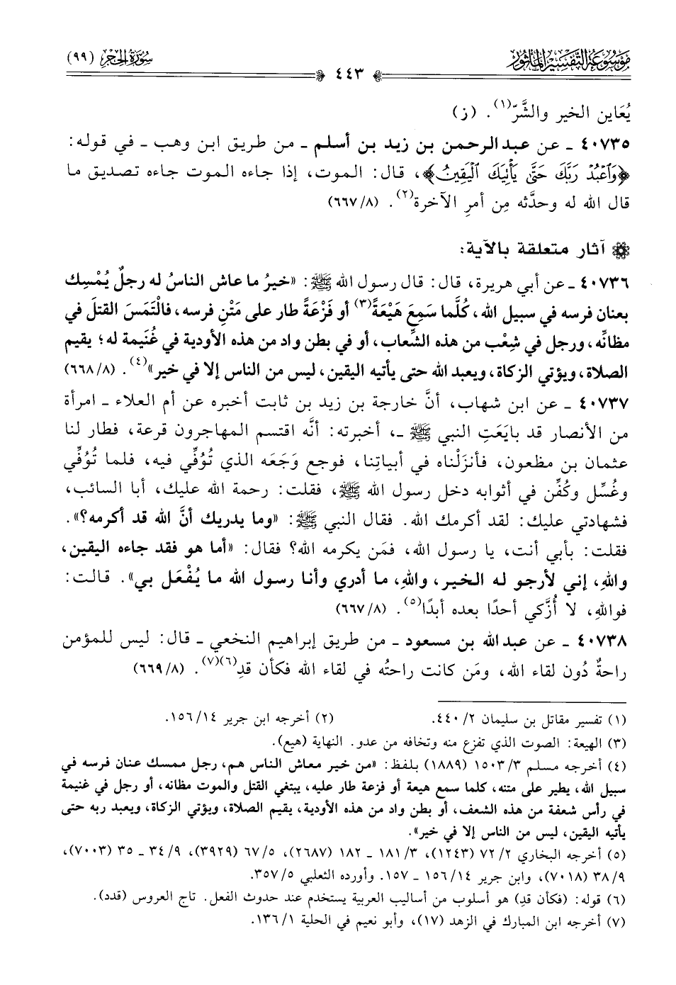٤٠٧٣٦ - عن أبي هريرة، قال: قال رسول الله - صلى الله عليه وسلم -: «خيرُ ما عاش الناسُ له رجلٌ يُمْسِك بعنان فرسه في سبيل الله، كُلَّما سَمِعَ هَيْعَةً (¬٣) أو فَزْعَةً طار على مَتْنِ فرسه، فالتَمَسَ القتلَ في مظانِّه، ورجل في شِعْب من هذه الشِّعاب، أو في بطن واد من هذه الأودية في غُنَيمة له؛ يقيم الصلاة، ويؤتي الزكاة، ويعبد الله حتى يأتيه اليقين، ليس من الناس إلا في خير» (¬٤). (٨/ ٦٦٨)