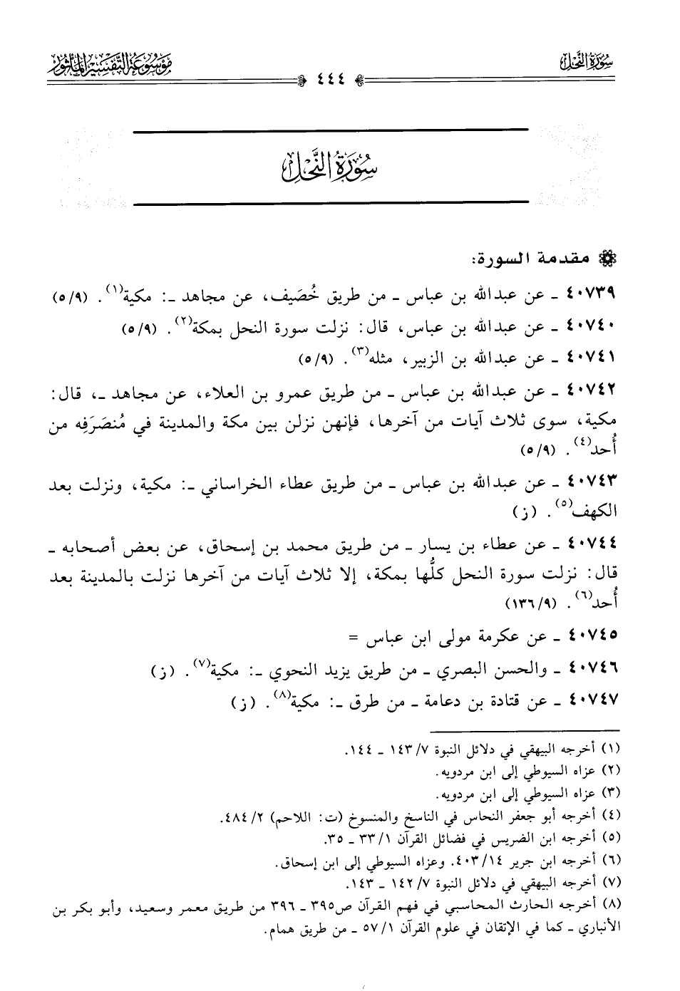 ٤٠٧٤٠ - عن عبد الله بن عباس، قال: نزلت سورة النحل بمكة (¬٢). (٩/ ٥)