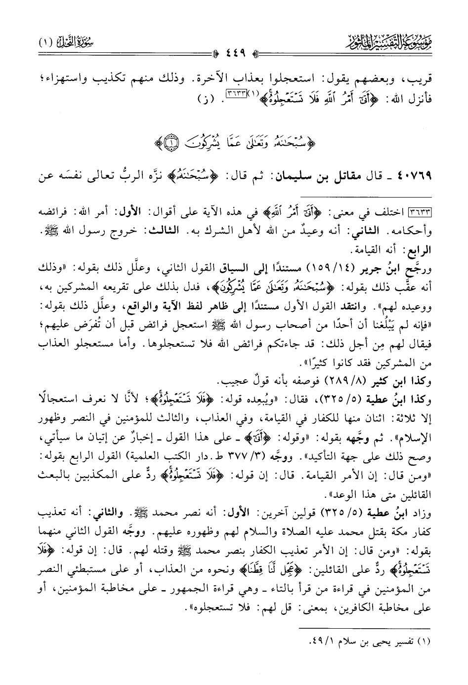 [٣٦٣٣] اختلف في معنى: {أتى أمْرُ اللَّهِ} في هذه الآية على أقوال: الأول: أمر الله: فرائضه وأحكامه. الثاني: أنه وعيدٌ من الله لأهل الشرك به. الثالث: خروج رسول الله - صلى الله عليه وسلم -. الرابع: أنه القيامة.