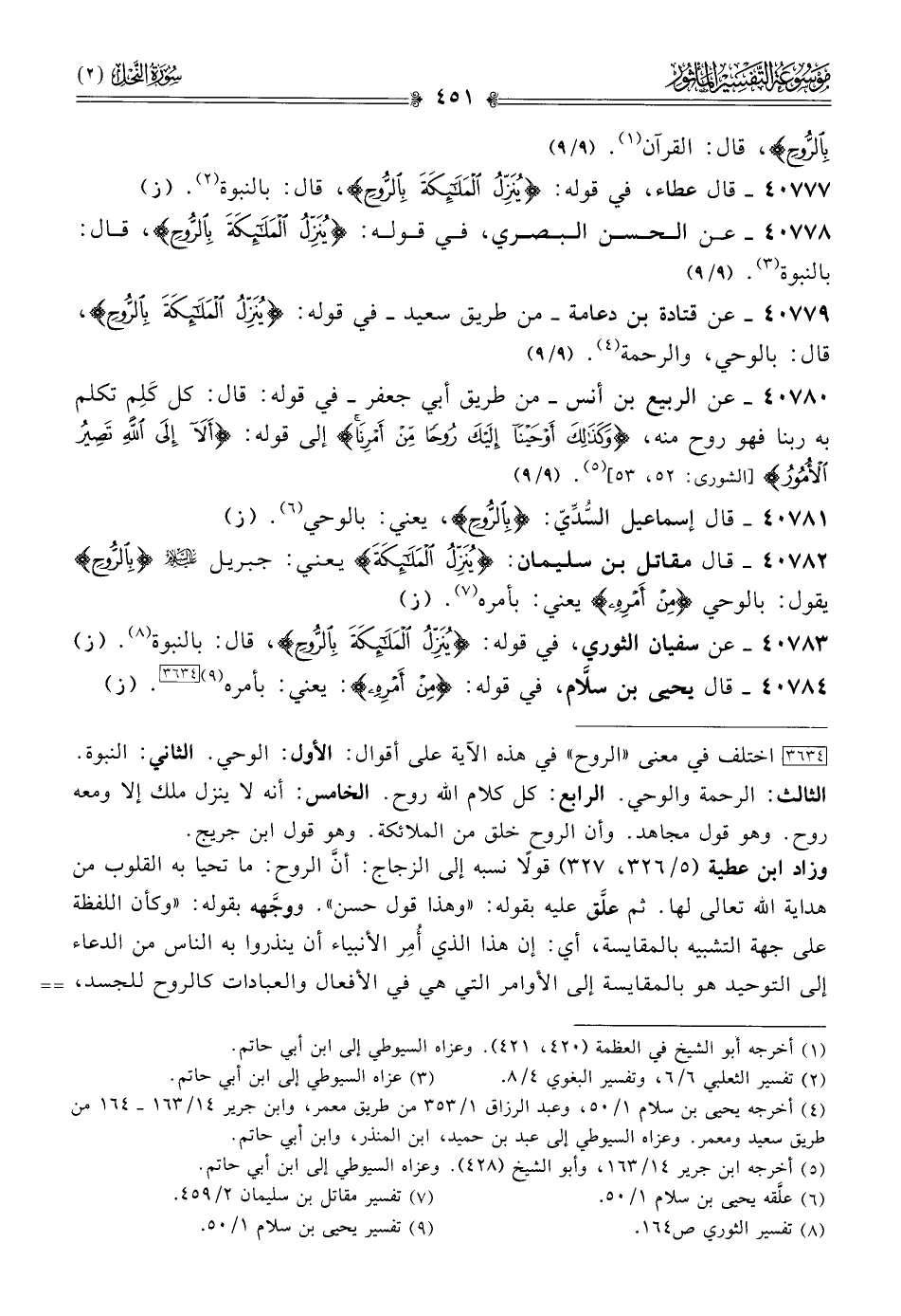 ٤٠٧٨٣ - عن سفيان الثوري، في قوله: {ينزل الملائكة بالروح}، قال: بالنبوة (¬٨). (ز)