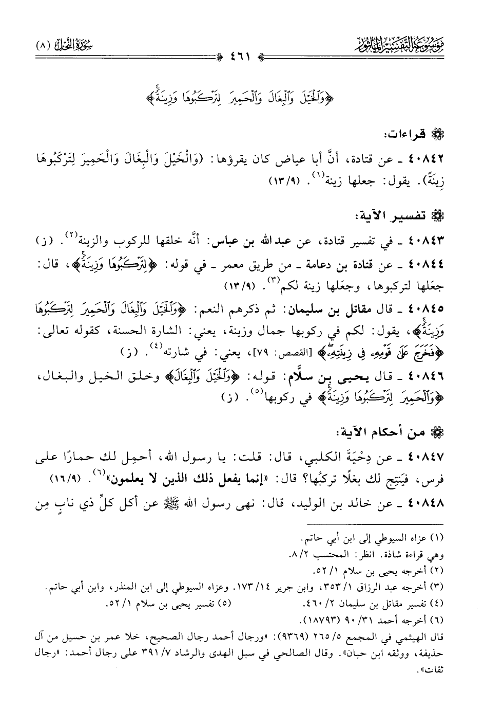 ٤٠٨٤٣ - في تفسير قتادة، عن عبد الله بن عباس: أنّه خلقها للركوب والزينة (¬٢). (ز)