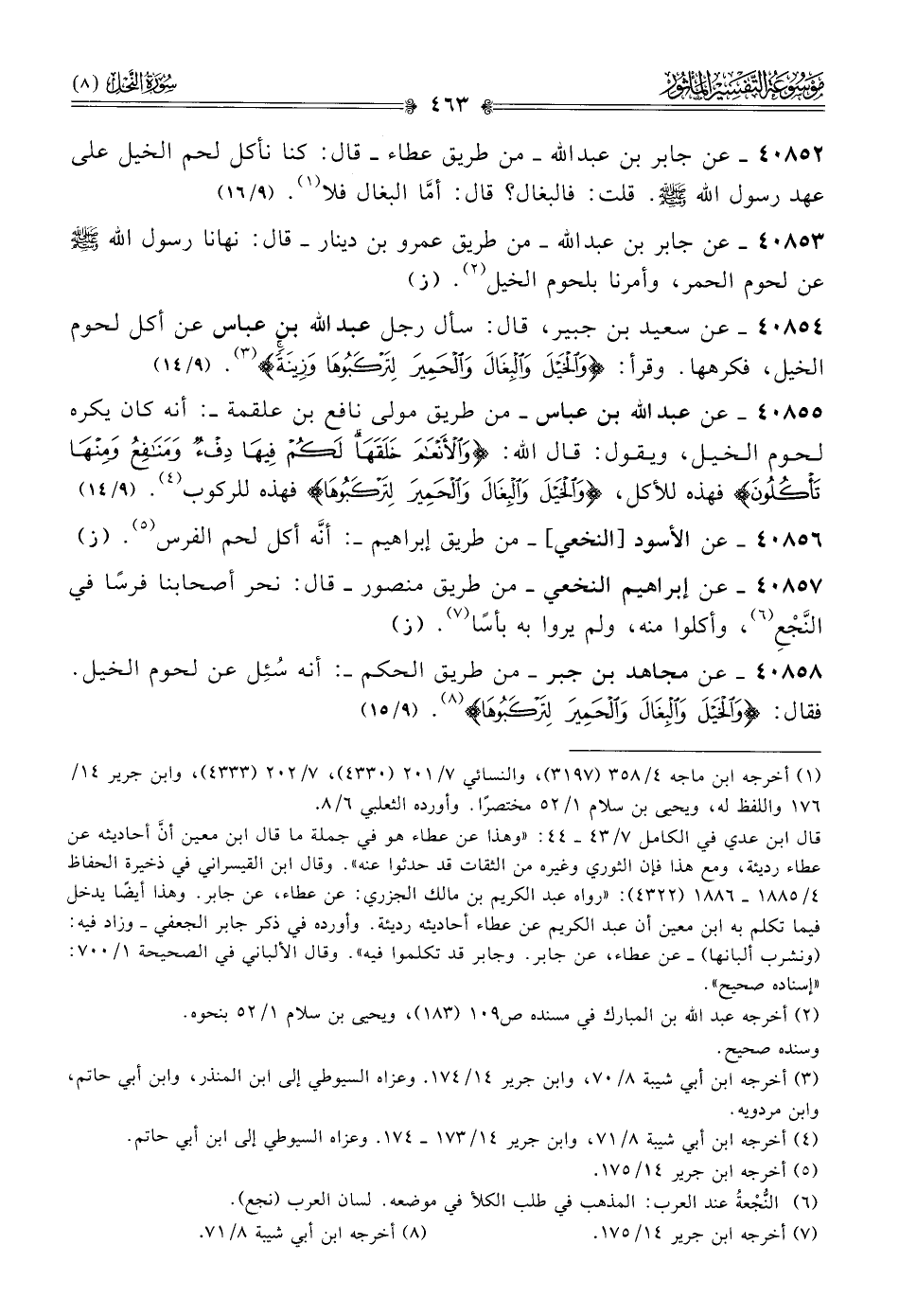 ٤٠٨٥٨ - عن مجاهد بن جبر -من طريق الحكم- أنه سُئِل عن لحوم الخيل. فقال: {والخيل والبغال والحمير لتركبوها} (¬٨). (٩/ ١٥)