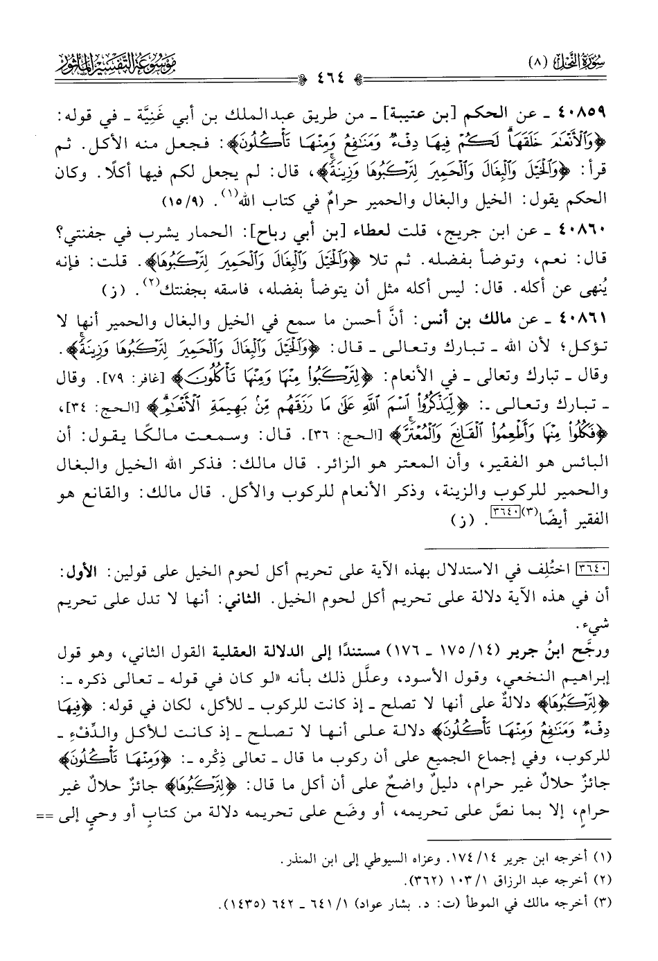 [٣٦٤٠] اختُلِف في الاستدلال بهذه الآية على تحريم أكل لحوم الخيل على قولين: الأول: أن في هذه الآية دلالة على تحريم أكل لحوم الخيل. الثاني: أنها لا تدل على تحريم شيء.