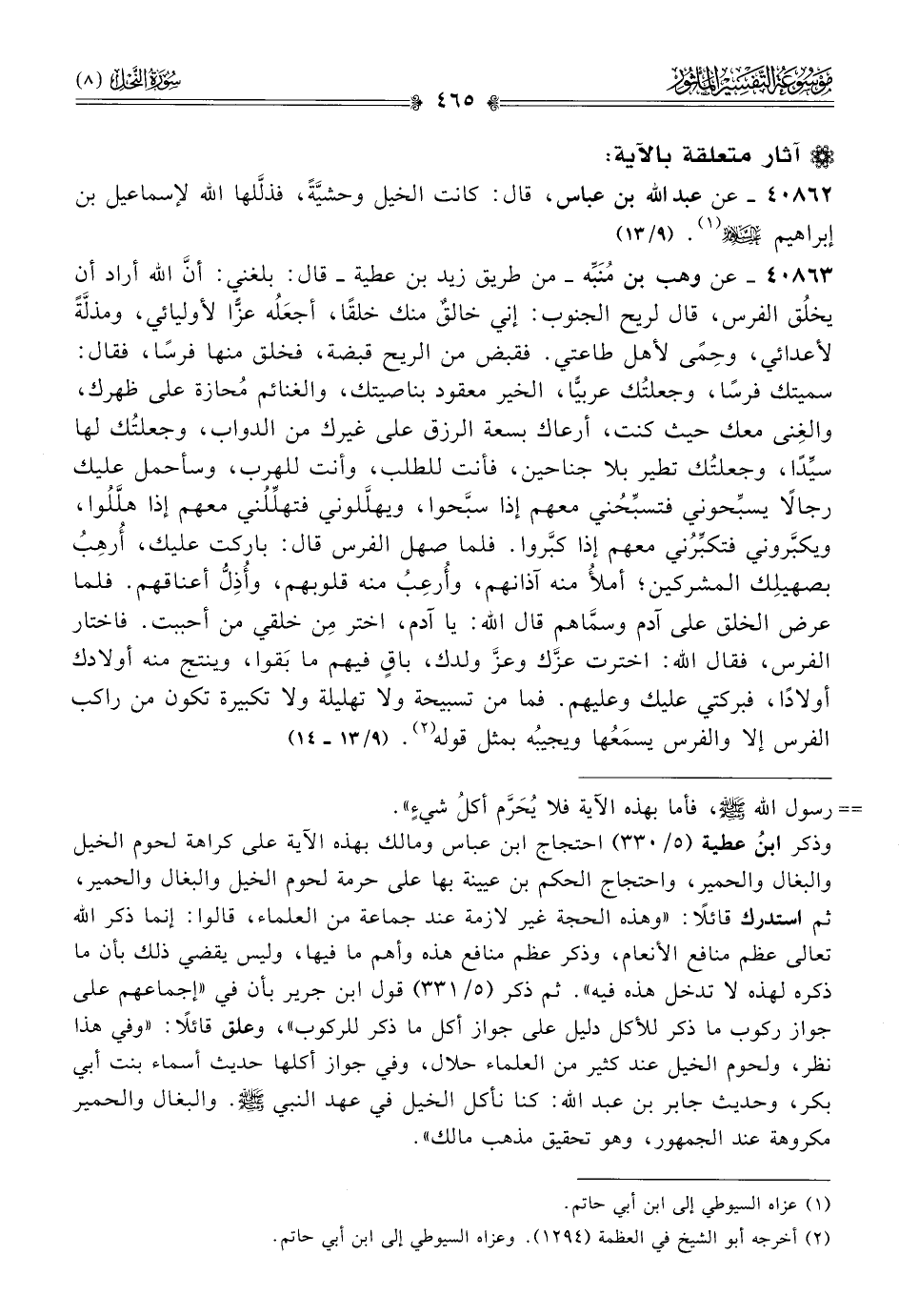 ٤٠٨٦٢ - عن عبد الله بن عباس، قال: كانت الخيل وحشيَّةً، فذلَّلها الله لإسماعيل بن إبراهيم? (¬١). (٩/ ١٣)