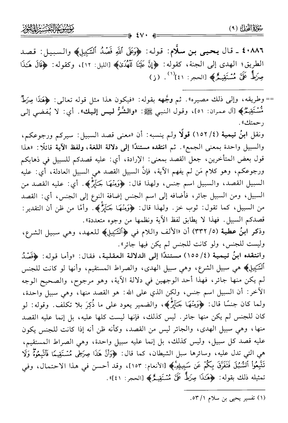 ٤٠٨٨٦ - قال يحيى بن سلّام: قوله: {وعلى الله قصد السبيل} والسبيل: قصد الطريق؛ الهدى إلى الجنة، كقوله: {إن علينا للهدى} [الليل: ١٢]، وكقوله: {قال هذا صراط علي مستقيم} [الحجر: ٤١] (¬١). (ز)