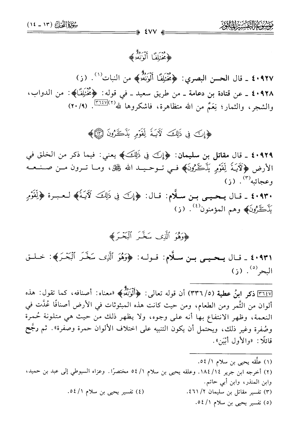 ٤٠٩٢٨ - عن قتادة بن دعامة -من طريق سعيد- في قوله: {مختلفًا}: من الدواب، والشجر، والثمار؛ نِعَمٌ من الله متظاهرة، فاشكروها لله (¬٢) [٣٦٤٧]. (٩/ ٢٠)