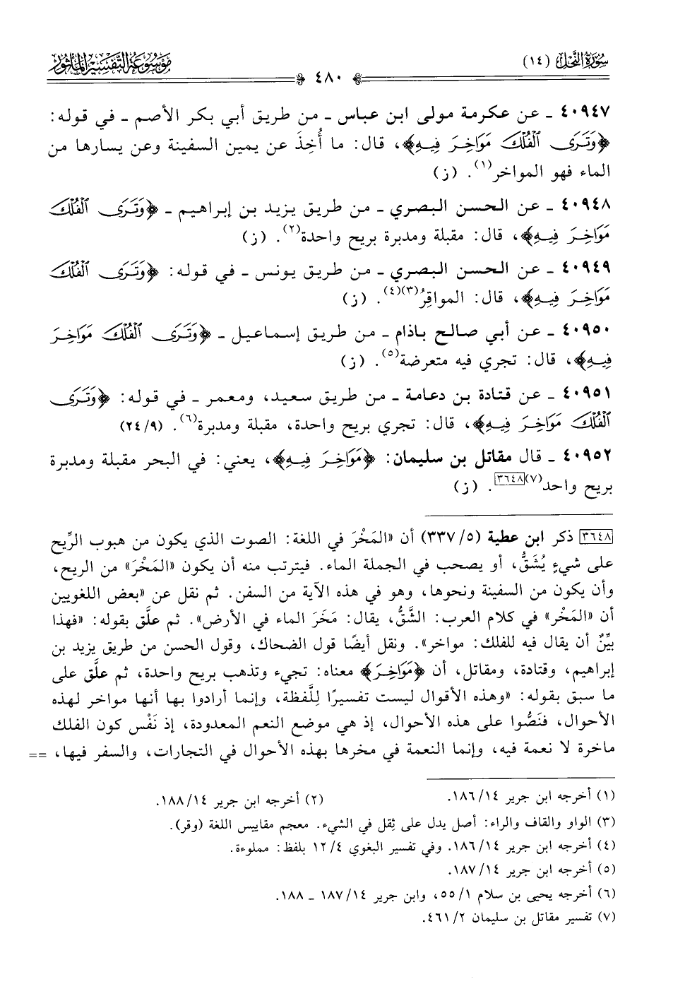 ٤٠٩٤٩ - عن الحسن البصري -من طريق يونس- في قوله: {وترى الفلك مواخر فيه}، قال: المواقِرُ (¬٣) (¬٤). (ز)