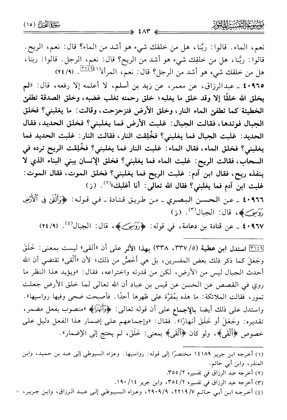 [٣٦٤٩] استدل ابن عطية (٥/ ٣٣٧، ٣٣٨) بهذا الأثر على أن «ألقى» ليست بمعنى: خَلَقَ وجَعَلَ كما ذكر ذلك بعض المفسرين، بل هي أخَصُّ من ذلك؛ لأن «ألْقى» تقتضي أن الله أحدث الجبال ليس من الأرض، لكن من قدرته واختراعه، فقال: «ويؤيد هذا النظر ما روي في القصص عن الحسن عن قيس بن عباد أن الله تعالى لما خلق الأرض جعلت تمور، فقالت الملائكة: ما هذه بمُقرَّة على ظهرها أحدًا. فأصبحت ضحى وفيها رواسيها». واستدل على ذلك أيضا بالإجماع على أن قوله تعالى: {وأَنْهارًا} «منصوب بفعل مضمر، تقديره: وجَعَلَ أو خَلَقَ أنهارًا». فقال: «وإجماعهم على إضمار هذا الفعل دليل على خصوص {ألْقى}، ولو كان {ألْقى} بمعنى: خَلَقَ، لم يحتج إلى الإضمار».