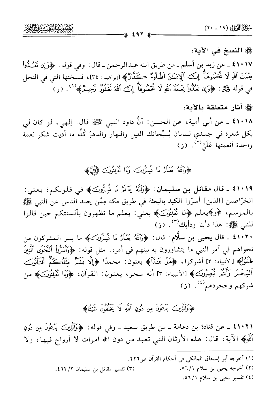 ٤١٠١٧ - عن زيد بن أسلم -من طريق ابنه عبد الرحمن- قال: وفي قوله: {وإن تعدوا نعمت الله لا تحصوها إن الانسان لظلوم كفار} [إبراهيم: ٣٤]، فنسختها التي في النحل في قوله - عز وجل -: {وإن تعدوا نعمة الله لا تحصوها إن الله لغفور رحيم} (¬١). (ز)