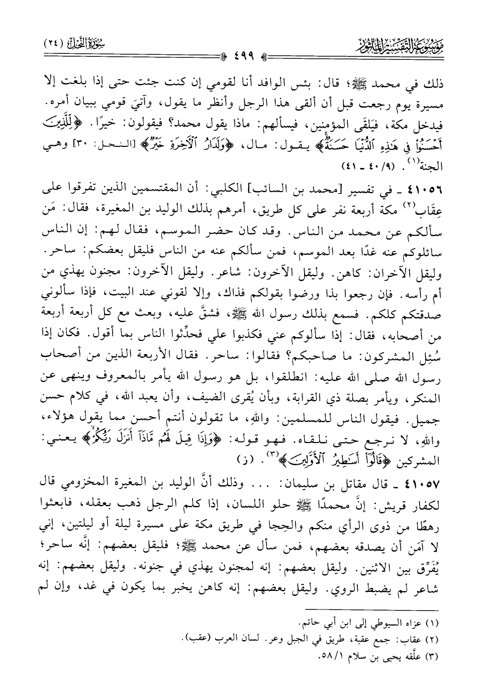 ٤١٠٥٦ - في تفسير [محمد بن السائب] الكلبي: أن المقتسمين الذين تفرقوا على عِقاب (¬٢) مكة أربعة نفر على كل طريق، أمرهم بذلك الوليد بن المغيرة، فقال: مَن سألكم عن محمد من الناس. وقد كان حضر الموسم، فقال لهم: إن الناس سائلوكم عنه غدًا بعد الموسم، فمن سألكم عنه من الناس فليقل بعضكم: ساحر. وليقل الآخران: كاهن. وليقل الآخرون: شاعر. وليقل الآخرون: مجنون يهذي من أم رأسه. فإن رجعوا بذا ورضوا بقولكم فذاك، وإلا لقوني عند البيت، فإذا سألوني صدقتكم كلكم. فسمع بذلك رسول الله - صلى الله عليه وسلم -، فشقَّ عليه، وبعث مع كل أربعة أربعة من أصحابه، فقال: إذا سألوكم عني فكذبوا علي فحدِّثوا الناس بما أقول. فكان إذا سُئِل المشركون: ما صاحبكم؟ فقالوا: ساحر. فقال الأربعة الذين من أصحاب رسول الله صلى الله عليه: انطلقوا، بل هو رسول الله يأمر بالمعروف وينهى عن المنكر، ويأمر بصلة ذي القرابة، وبأن يُقرى الضيف، وأن يعبد الله، في كلام حسن جميل. فيقول الناس للمسلمين: واللهِ، ما تقولون أنتم أحسن مما يقول هؤلاء، واللهِ، لا نرجع حتى نلقاه. فهو قوله: {وإذا قيل لهم ماذا أنزل ربكم} يعني: المشركين {قالوا أساطير الأولين} (¬٣). (ز)