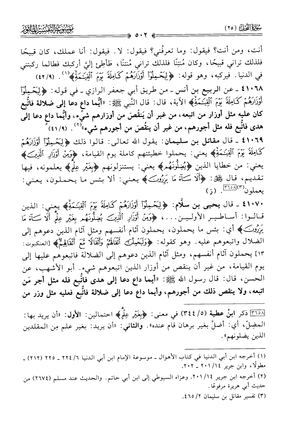 ٤١٠٦٨ - عن الربيع بن أنس -من طريق أبي جعفر الرازي- في قوله: {ليحملوا أوزارهم كاملة يوم القيامة} الآية، قال: قال النَّبي - صلى الله عليه وسلم -: «أيُّما داعٍ دعا إلى ضلالة فاتُّبِع كان عليه مثل أوزار من اتبعه، من غير أن يَنقُصَ من أوزارهم شيء، وأيُّما داعٍ دعا إلى هدى فاتُّبِع فله مثل أجورهم، من غير أن ينقُصَ من أجورهم شيء» (¬٢). (٩/ ٤١)