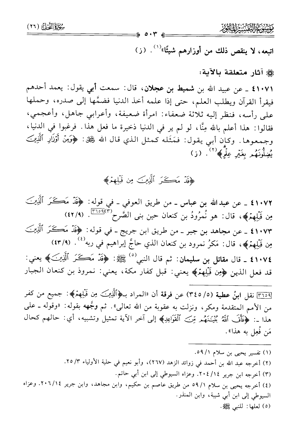 ٤١٠٧٣ - عن مجاهد بن جبر -من طريق ابن جريج- في قوله: {قد مكر الذين من قبلهم}، قال: مَكرُ نمرود بن كنعان الذي حاجَّ إبراهيم في ربه (¬٤). (٩/ ٤٣)