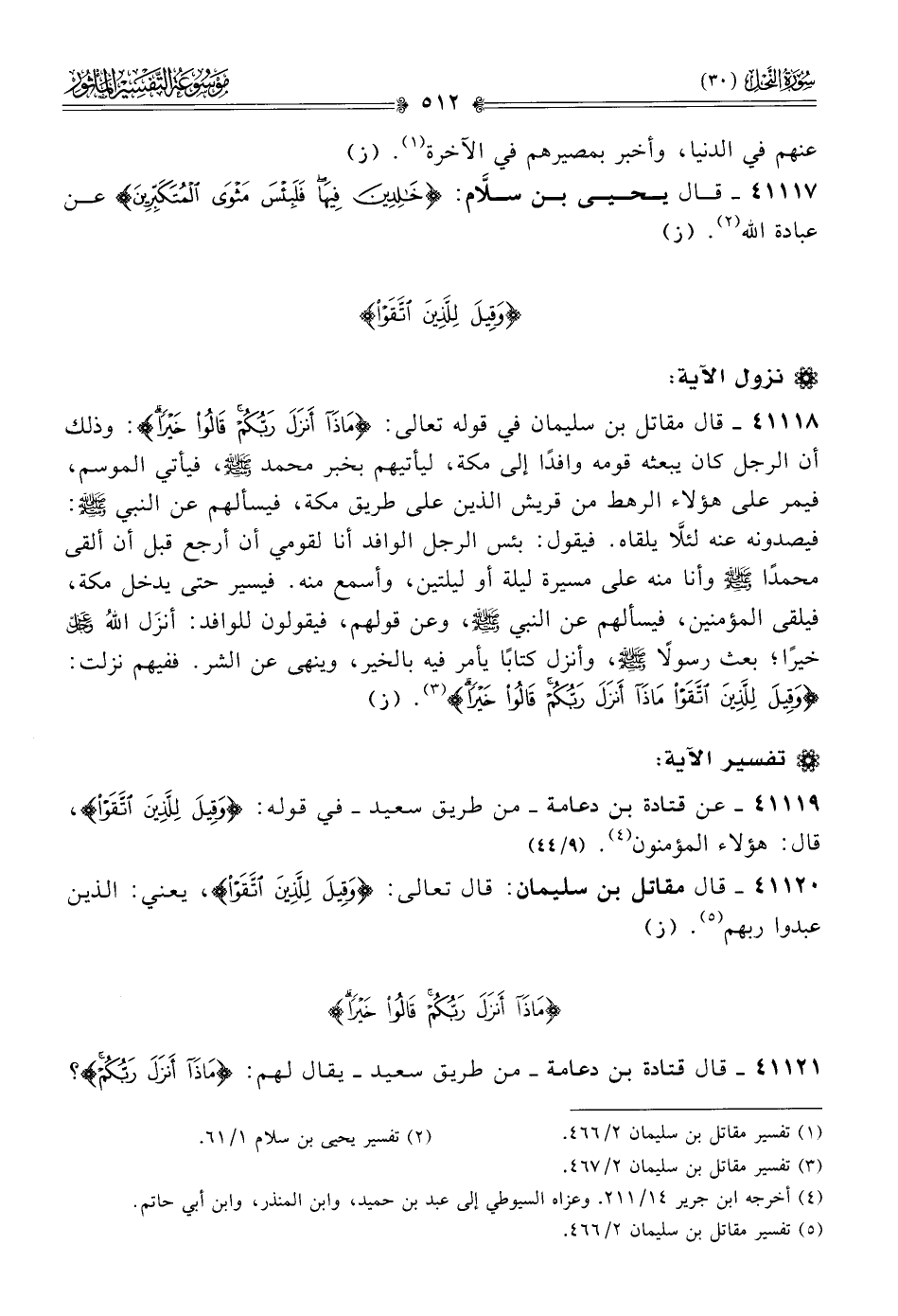 ٤١١١٨ - قال مقاتل بن سليمان في قوله تعالى: {ماذا أنزل ربكم قالوا خيرا}: وذلك أن الرجل كان يبعثه قومه وافدًا إلى مكة، ليأتيهم بخبر محمد - صلى الله عليه وسلم -، فيأتي الموسم، فيمر على هؤلاء الرهط من قريش الذين على طريق مكة، فيسألهم عن النبي - صلى الله عليه وسلم -: فيصدونه عنه لئلّا يلقاه. فيقول: بئس الرجل الوافد أنا لقومي أن أرجع قبل أن ألقى محمدًا - صلى الله عليه وسلم - وأنا منه على مسيرة ليلة أو ليلتين، وأسمع منه. فيسير حتى يدخل مكة، فيلقى المؤمنين، فيسألهم عن النبي - صلى الله عليه وسلم -، وعن قولهم، فيقولون للوافد: أنزَل اللهُ - عز وجل - خيرًا؛ بعث رسولًا - صلى الله عليه وسلم -، وأنزل كتابًا يأمر فيه بالخير، وينهى عن الشر. ففيهم نزلت: {وقيل للذين اتقوا ماذا أنزل ربكم قالوا خيرا} (¬٣). (ز)