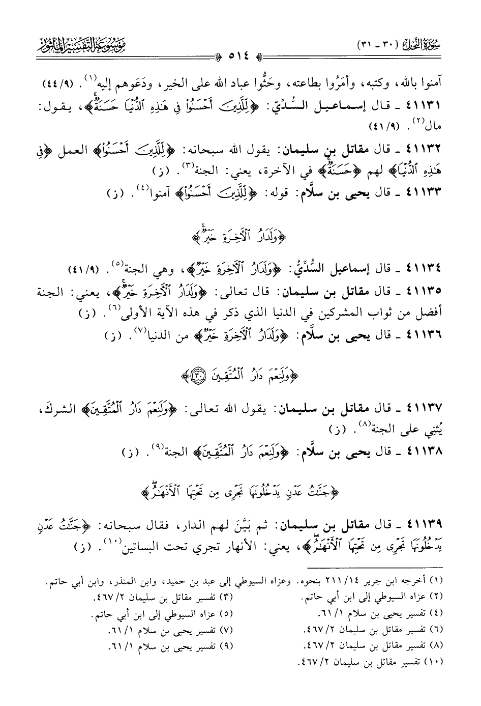٤١١٣٨ - قال يحيى بن سلّام: {ولنعم دار المتقين} الجنة (¬٩). (ز)