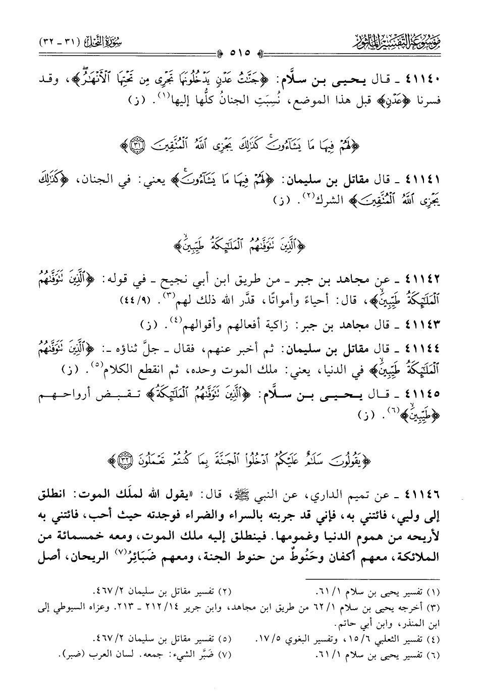 ٤١١٤٥ - قال يحيى بن سلّام: {الذين تتوفاهم الملائكة} تقبض أرواحهم {طيبين} (¬٦). (ز)