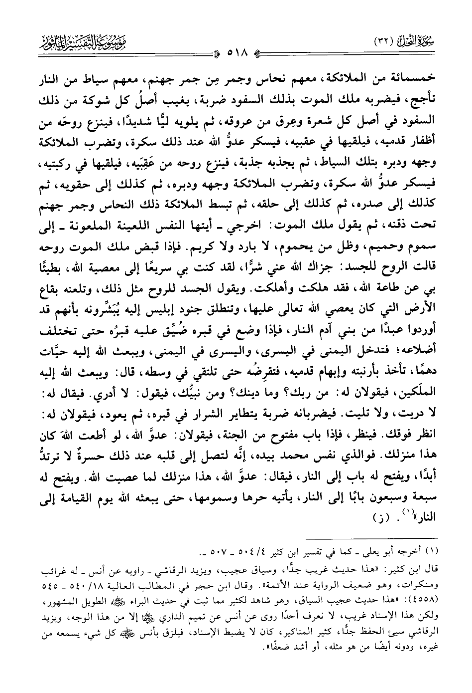 خمسمائة من الملائكة، معهم نحاس وجمر مِن جمر جهنم، معهم سياط من النار تأجج، فيضربه ملك الموت بذلك السفود ضربة، يغيب أصلُ كل شوكة من ذلك السفود في أصل كل شعرة وعِرق من عروقه، ثم يلويه ليًّا شديدًا، فينزع روحَه من أظفار قدميه، فيلقيها في عقبيه، فيسكر عدوُّ الله عند ذلك سكرة، وتضرب الملائكة وجهه ودبره بتلك السياط، ثم يجذبه جذبة، فينزع روحه من عَقِبَيه، فيلقيها في ركبتيه، فيسكر عدوُّ الله سكرة، وتضرب الملائكة وجهه ودبره، ثم كذلك إلى حقويه، ثم كذلك إلى صدره، ثم كذلك إلى حلقه، ثم تبسط الملائكة ذلك النحاس وجمر جهنم تحت ذقنه، ثم يقول ملك الموت: اخرجي -أيتها النفس اللعينة الملعونة- إلى سموم وحميم، وظل من يحموم، لا بارد ولا كريم. فإذا قبض ملك الموت روحه قالت الروح للجسد: جزاك الله عني شرًّا، لقد كنت بي سريعًا إلى معصية الله، بطيئًا بي عن طاعة الله، فقد هلكت وأهلكت. ويقول الجسد للروح مثل ذلك، وتلعنه بقاع الأرض التي كان يعصي الله تعالى عليها، وتنطلق جنود إبليس إليه يُبَشِّرونه بأنهم قد أوردوا عبدًا من بني آدم النار، فإذا وضع في قبره ضُيِّق عليه قبرُه حتى تختلف أضلاعه؛ فتدخل اليمنى في اليسرى، واليسرى في اليمنى، ويبعث الله إليه حيّات دهمًا، تأخذ بأرنبته وإبهام قدميه، فتقرِضُه حتى تلتقي في وسطه، قال: ويبعث الله إليه الملَكين، فيقولان له: من ربك؟ وما دينك؟ ومن نبيُّك، فيقول: لا أدري. فيقال له: لا دريت، ولا تليت. فيضربانه ضربة يتطاير الشرار في قبره، ثم يعود، فيقولان له: انظر فوقك. فينظر، فإذا باب مفتوح من الجنة، فيقولان: عدوَّ الله، لو أطعت اللهَ كان هذا منزلك. فوالذي نفس محمد بيده، إنّه لتصل إلى قلبه عند ذلك حسرةٌ لا ترتدُّ أبدًا، ويفتح له باب إلى النار، فيقال: عدوَّ الله، هذا منزلك لما عصيت الله. ويفتح له سبعة وسبعون بابًا إلى النار، يأتيه حرها وسمومها، حتى يبعثه الله يوم القيامة إلى النار» (¬١). (ز)