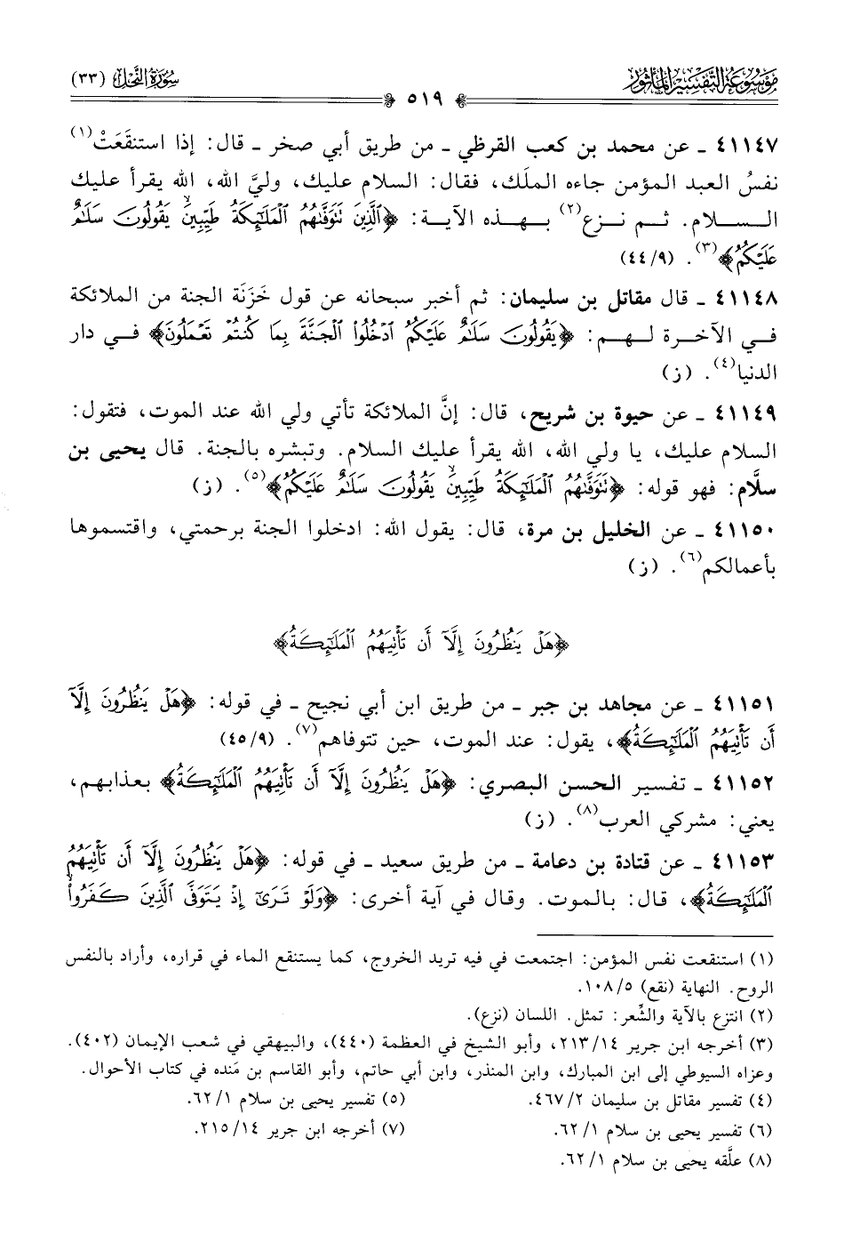 ٤١١٥١ - عن مجاهد بن جبر -من طريق ابن أبي نجيح- في قوله: {هل ينظرون إلا أن تأتيهم الملائكة}، يقول: عند الموت، حين تتوفاهم (¬٧). (٩/ ٤٥)